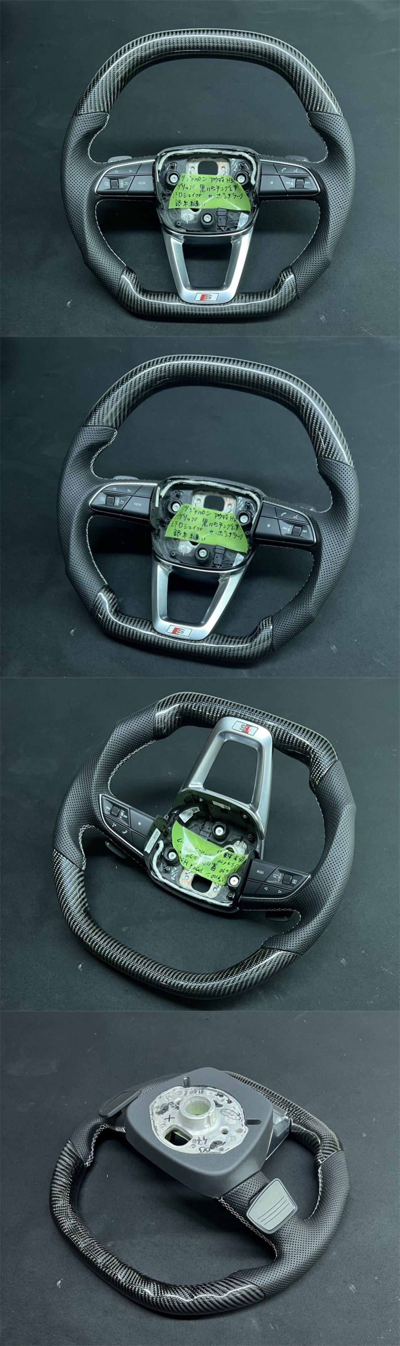 商品詳細 | ◆適合車種:A6他Q3Q5/8N8K8M等 ※Sラインには取り付け不可 ◆本体履歴:2020年式Q5(8R)新車取出し ◆仕様:3Dガングリップ、コブ付き/上下D‐shape ◆純正風レザー張替え(黒系/本革)欧州縫い ◆天然ウッドコンビ加工/カーボンブラック ◆多重層樹脂グロスコーティング塗装/光沢艶あり ※エアバックやカバーリング等は付きません。 (上記は現在のお客様のものをそのまま移設下さいませ) |