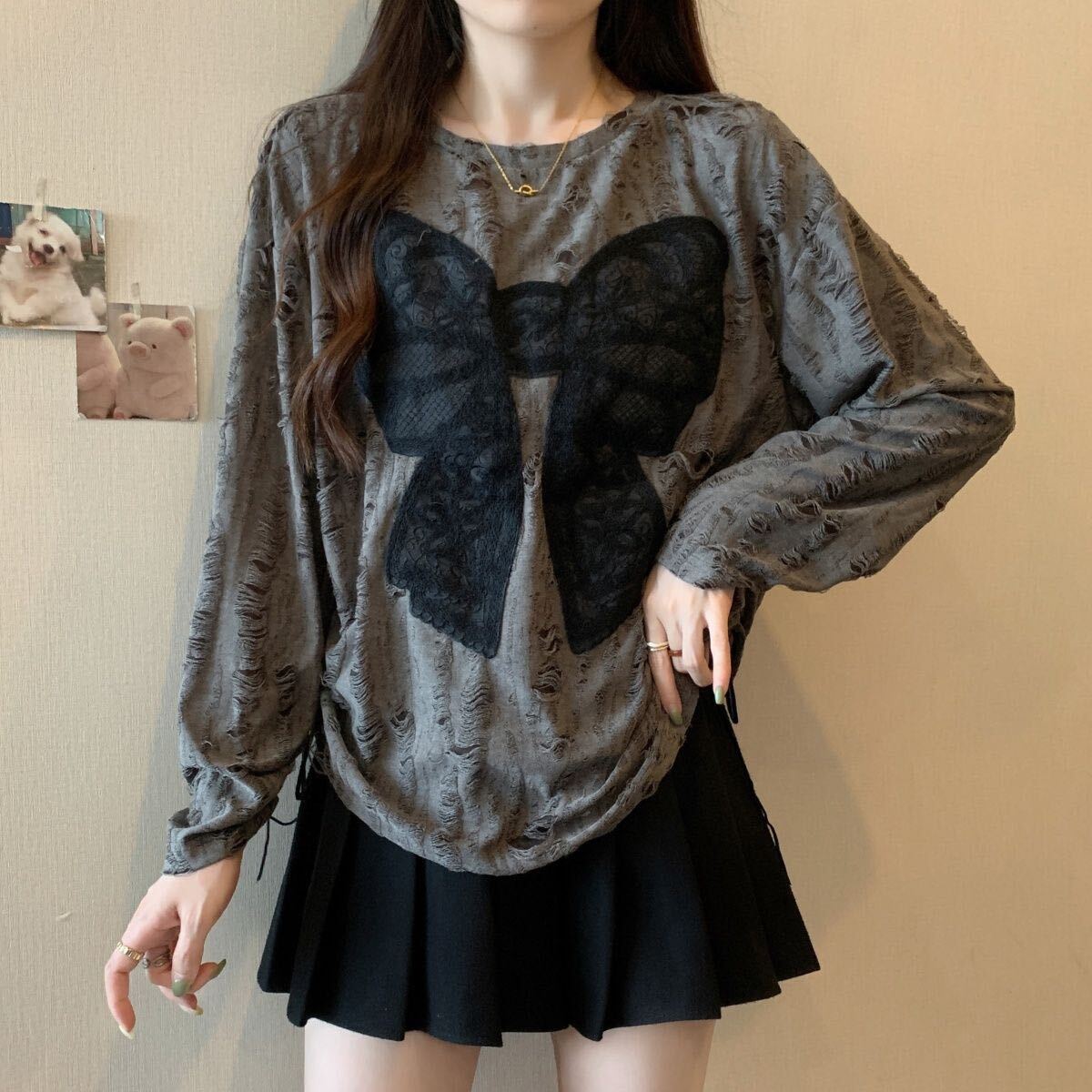 ロングTシャツ カットソー ロングT ロンT ダメージ加工 蝶結び レディース 大きいサイズ 春 秋 秋服 春服 長袖 薄手 丸首 トップス ゆったり 可愛い カジュアル 個性的 SLUD001(M-4XL)| 出价者 | 信用 | 价格 | 时间 |