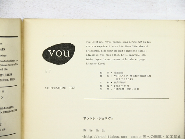(雑誌)VOU 47号 / 北園克衛 編 ◯当店在庫から「北園克衛」の本を探す| ★ 発送方法 (送料無料) ・日本郵便のゆうパケット・レターパックライト・レターパックプラス・ゆうパックの中から荷姿の大きさに適した方法で発送します。(発送方法や到着日時はご指定いただけません。) ・上記発送方法はすべて追跡番号付き・土日配送有・速達扱いです。ゆうメールや定形外は発送に使用いたしません。 ・ゆうパケット・レターパックライトは郵便受けにお届け、レターパックプラス・ゆうパックは配達員対面受取です。防水梱包します。 ★ 必ずお読みください ・代金決済後の次の火木土に発送します。 ・ストア出品です。ご注文時に必要事項のご記入・決済いただいた後は、やり取り不要です。商品の到着をお待ち下さい。 ・肉筆物・美術作品は真作保証いたします。 ・商品のレファレンス(調べ物)サービスは行っておりません。また当店商品以外の無料鑑定は行っておりません。 |