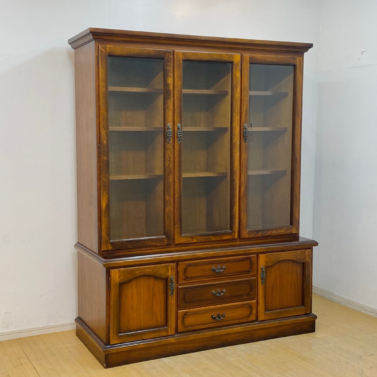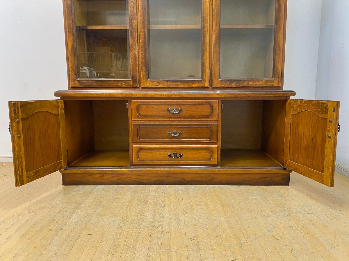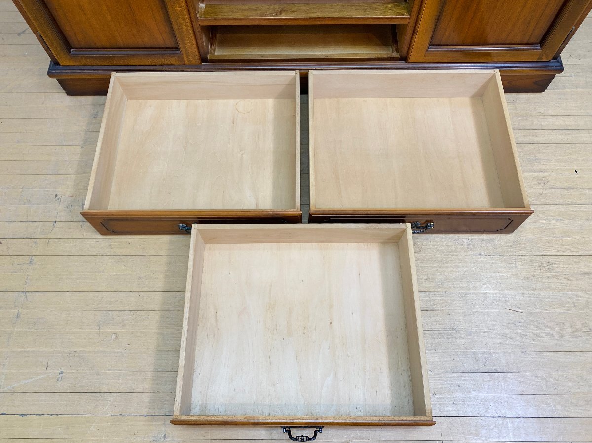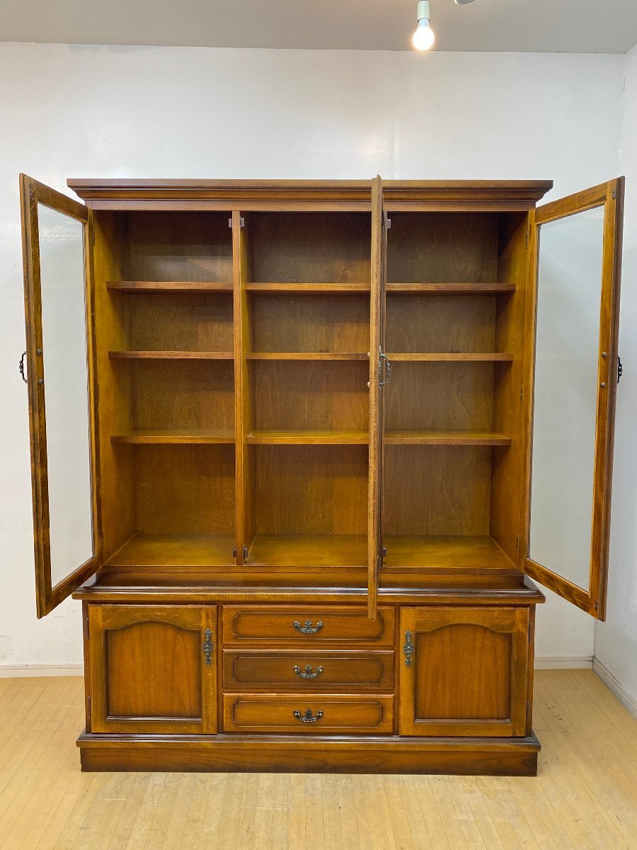 ■ブランド karimoku カリモク家具 ■シリーズ コロニアル ■品名 書棚 ■サイズ 外寸:約 幅/1510mm × 奥行/580mm × 高さ/1910mm 引出し内寸:約 幅/520mm × 奥行/430mm × 深さ/110mm 棚板:約 幅/455mm × 奥行/290mm ■材質 天然木(コロニアルウォールナット色)、鋳物金具、ガラス ■参考価格(同型と比較) 400,000円前後 ■備考 上下固定金具あり