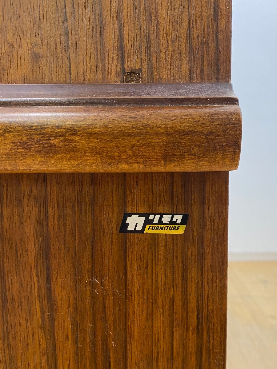 こちらはカリモク家具の書棚です。 中古品です。 【karimoku カリモク家具】 カリモク家具は1940年に愛知県刈谷市で創業した国内製造家具メーカーです。 「100歳の木を使うなら、その年輪にふさわしい家具を作りたい」との思いで家具づくりを行っている、 日本で最もスタンダードな家具メーカーのひとつです。 その中で特にカタカナで【カリモク】と表記されたお品は、1960~1980年代にかけて、昭和の日本の家庭で愛され 現在では通称「オールドカリモク」と呼ばれる、家具愛好家やカリモクファンから絶大な人気を誇るお品物たちです。 近年では、当時の家具を再現したカプセルトイやミニチュアなども発売され、今もなお愛され親しまれています。 カリモクのコロニアルシリーズより大型書棚のご紹介です。 洋館にあるような、アンティークな雰囲気を漂わせる一品です。 コロニアルシリーズは1970年代から今日まで作り続けられている人気シリーズで、 アンティークやクラシックな雰囲気がお好きな方に好まれています。 本モデルは既に廃番となった希少なオールドカリモクです。 上段は3つに仕切られている扉収納で棚板は可動式です。 下段には引出し収納が付いていて、書類の収納にもぴったりです。 窓の上部がカーブしているデザインは多く見られますが、直線のデザインは珍しいかと思います。 書棚のほか、食器棚や飾り棚としても使っていただけると思います。 こちらは2段重ねとなっていますので、発送の際は分割してお送りします。 コロニアルスタイルの空間でくつろぎの時間を過ごしてみてはいかがでしょうか。 【コンディションについて】 古いもののため、経年によるキズや打痕、塗装剥がれなど使用感のあるお品です。 裏面の下側は木部の浮きが見られますが、ご使用には問題ない程度です。 引出し最下段の取手金具は新品に交換しています。 ネジの部分は新旧でデザインが異なりますのでご承知おきください。 古いものですが、作りも良く今後も長くご愛用いただけるお品となっています。 他詳細については下記画像も併せてご参照ください。 ![]() ![]() ![]() ![]() ![]() この機会に是非ご検討ください。皆様のご入札お待ちしております。 再良市場の他のお品物はこちらから!