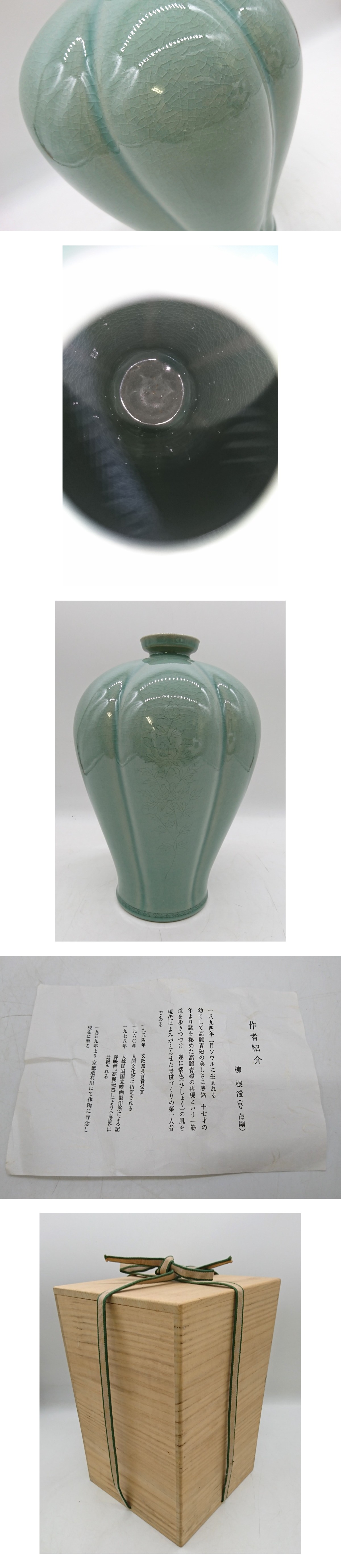 美品 韓国人間文化財 柳海剛 (柳根瀅) 高麗青磁 瓜形 梅瓶 花瓶 工芸品を出品致します。