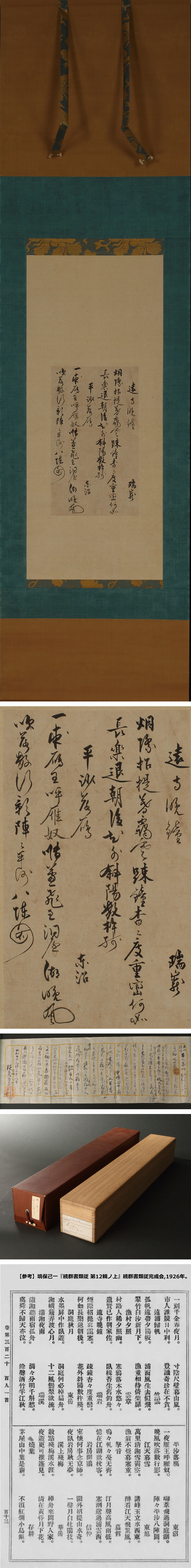 横川景三の墨蹟です。 瀟湘八景の内、「遠寺晩鐘」「平沙落雁」を吟じた瑞巌龍惺および東沼周暾の詩二篇を収めた断簡です。 遠山記念館元館長・山辺知行の旧蔵となる「山辺コレクション」の貼札および鎌倉芳太郎の添状が付属し、元は美術研究家・堀口蘇山の旧蔵する書巻であり、旧出羽米沢藩主・上杉伯爵家什であることを示す箱が添っていた所、蘇山が分割した旨、横川の記名を有する巻首と自詠の巻末「応制富士山」をみずから表装した上で平櫛田中などの工芸家に残りの断簡を譲ったことが記されております。 鎌倉芳太郎・山辺知行は共に沖縄染織の研究者であり、明治期に沖縄県令を務めた上杉茂憲の縁で米沢出身者が多数を占めた沖縄学界(鎌倉と共に沖縄で研究活動を行った建築家伊藤忠太など)・民藝界(日本民藝協会・田中俊雄など)共に相当の知己が存したことが推測されます。昭和50(1975)年の時点で堀口家に未裁断の残欠が遺されていたことが鎌倉の証言により判明しており、本作はその一部を改めて分割し、表装したものとみられます。 景三と上杉家の交流については、上杉房実が足利義政の寿像に横川の着賛を請うた歴史的事実が存し、両者は室町幕府や義政の文芸サロンで主導的役割を有していたとみられ、横川自筆・上杉伯爵家旧蔵の所伝も相当の信憑性を帯びたものと推察されます。『五山詩僧百人一首』には鎌倉報国寺伝来・徳富蘇峰旧蔵の伝横川自筆成簣堂文庫本が存し、明治42(1909)年に民友社により写真石版本として刊行されたこともまた知られており、古筆切愛好の時代とはいえ、本墨蹟が完本のまま学術的調査を経ず分割されたことは五山文学研究において痛惜の一言に尽きるでしょう。今後更なる考究が俟たれる逸品です。 ◆横川景三 室町後期の禅僧。臨済宗。京都相国寺常徳院の英叟につき,曇仲道芳の三十三回忌を機に曇仲の法をつぐ。応仁の乱で近江にうつり,豪族小倉実澄とまじわる。のち相国寺,南禅寺の住持。五山文学の中期を代表する文筆僧のひとり。明応2(1493)年寂、65歳。号は小補,補庵。著作に「補庵集」「小補東遊集」など。 ◆瑞巌龍惺 室町期の禅僧。臨済宗。建仁寺の一庵一麟に師事,その法をつぐ。建仁寺,南禅寺の住持となる。長禄4(1460)年寂、77歳。和泉出身。法名ははじめ竜章。道号ははじめ仲建。号は蝉庵(闇),稲庵。著作に「瑞巌和尚語録」「蝉闇外藁」。 ◆東沼周暾 室町期の禅僧。近江の人。臨済宗。建仁寺の遊叟周芸の法をつぐ。惟肖得巌らに詩文をまなび,「荘子」にくわしかった。建仁寺住持をへて相国寺住持。寛正3(1462)年寂、72歳。別号に祥光老子,留月道人。著作に「流水集」,語録に「東沼和尚語録」。 ◆堀口蘇山 昭和前期の古美術研究家。美術雑誌「芸苑巡礼」を刊行するほか『関東の裸形像』『弘明寺十一面観世音菩薩像』(共に芸苑巡礼社刊)などの著作で知られる。昭和49(1974)年没。 ◆鎌倉芳太郎 大正~昭和期の染織家、沖縄文化研究者。美術教師として赴任した沖縄県で、琉球王国時代からの沖縄独特の芸術や文化に心を奪われその研究を開始。沖縄伝統の染織技法である紅型の技術を継承し、重要無形文化財「型絵染」の保持者(人間国宝)に認定された一方、第二次世界大戦前に沖縄の文化財を調査し、その時に遺した数々の写真やメモは、後に沖縄戦で壊滅に瀕した沖縄文化の保存や復旧に大きく役立った。昭和58(1983)年没、84歳。 ◆山辺知行 昭和-平成期の染織研究家。京都帝大卒業後,東京帝室博物館(現東京国立博物館)に勤務。退官後,多摩美大教授,遠山記念美術館館長などをつとめた。日本,インド,インドネシアの染織品・人形のコレクターとしても知られた。平成16(2004)年没、97歳。東京出身。著作に「能装束文様集」など。 〔本文〕 遠寺晩鐘 瑞巌 煙際招提暮靄寒疎鐘杳々度重巒何如 長楽退朝後花外斜陽数杵残 平沙落雁 東沼 一夜雁王呼雁奴啣葦飛過洞底湖晩風 吹落数行影陣々平沙八陣図 付属:識箱(遠山記念館山辺コレクション小口貼札)・鎌倉芳太郎書簡が付属します。 寸法:総丈152cm、幅40cm(最大幅。若干の誤差はご了承下さい) 状態:経年のイタミがございます。 |