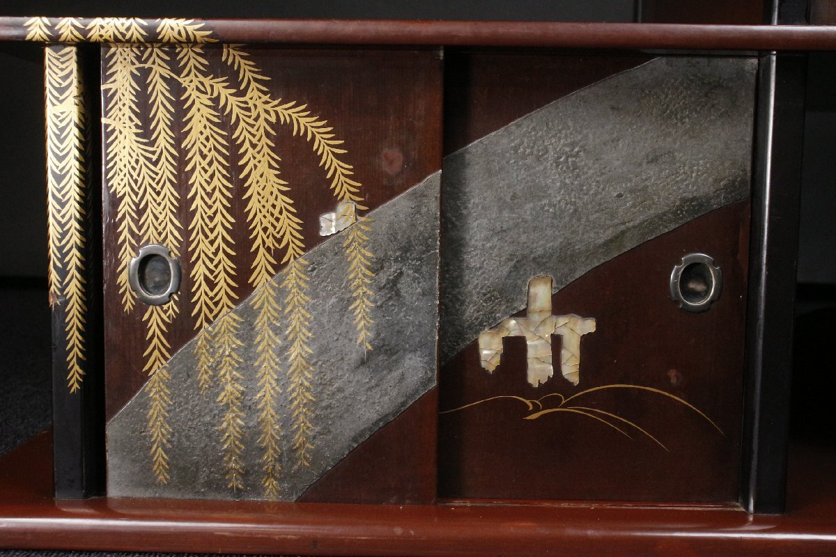 [.QU]25.9 250092948| * * * 商品詳細 * * * ここでしか出逢うことのできない唯一の美をご紹介させて頂きます。 風流で情感のある蒔絵が施された飾棚のご紹介です。 風に揺れる柳の様子が美しく表現されており、華やかさがありながらも落ち着きがあります。 螺鈿の輝きも美しく、鮮やかな金蒔絵が豪華です。 深く明るい色彩は奥深く、上品で古風な和の魅力が存分に味わえる逸品です。 この機会に是非お求めください。 ■サイズ/横77cm×高43.5cm×奥行37㎝ ■状態/スレ、キズ、欠け、剥げ、潰れ、割れがあり、 扉の金具に一部欠損がございます。     ※写真にてご確認、ご了承の上ご入札ください。  !かんたん決済  * * * 発送詳細 * * *  入金確認後3営業日以内に発送致します。 ※直接引き取りも可能です。 60~160サイズにつきましては 佐川急便、ゆうパックのどちらかで発送いたします。 ゆうパック発送の場合、弊社の発送日から追跡サービスに問合せ番号が反映されるまで 約1日ほどお時間がかかりますのでご了承下さい。 * * * 注意事項 * * * 運送中の破損があった場合は速やかに当社までご連絡下さい。  保険を利用するのに受取連絡後に運送会社による現場での破損状況確認が必要となります。  勝手に返送されますと保険の適用外となりますのでご注意ください。  * * * * * * お問い合わせ:082-236-8669 |