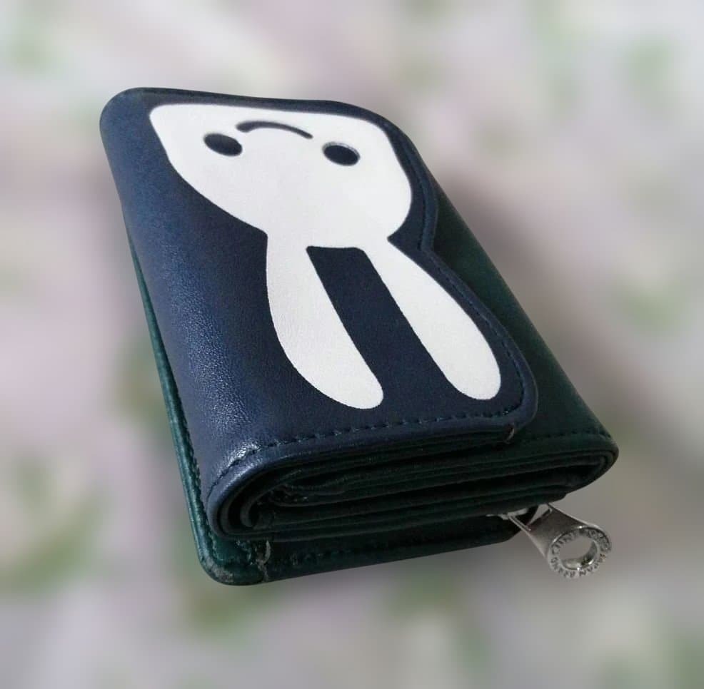 フラップがウサギ型のウォレット。目口は素押し加工をし、立体感を出しています。内側はカード入れが6ポケット、お札入れが1箇所で「裏面」とプリントされています。ファスナー小銭入れには「おかねがたくさんたまりますように」とプリントされています。