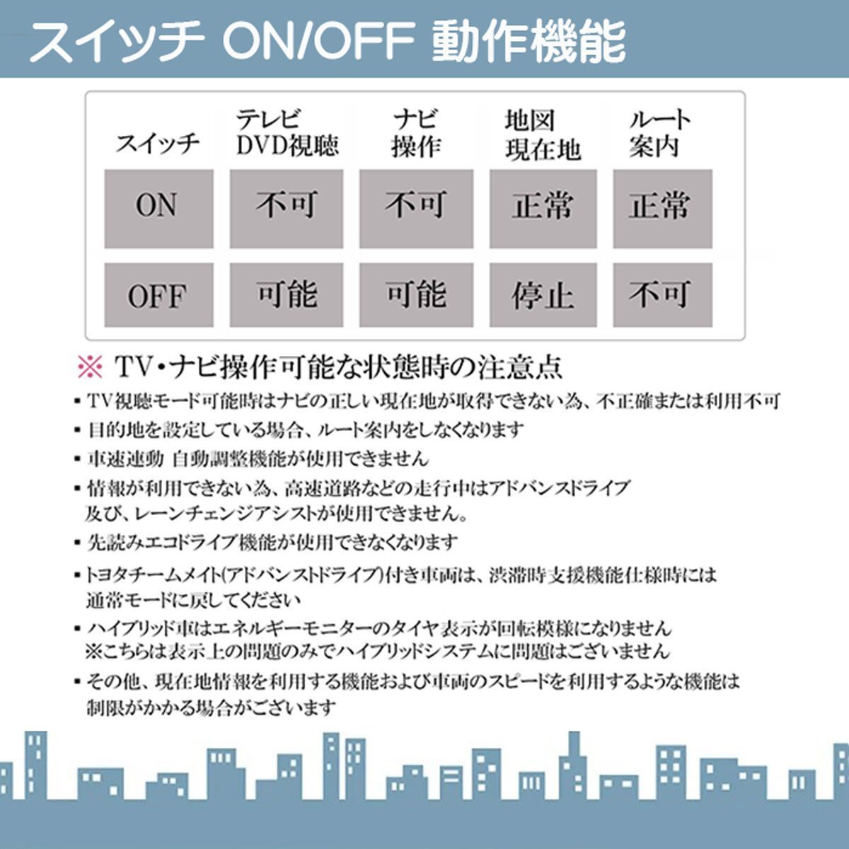 主な適合車種 ヴォクシー (ハイブリッド含む) MZRA90W/95W ZWR90W/95W (年式:令和4.1~) ノア (ハイブリッド含む) MZRA90W/95W ZWR90W/95W (年式:令和4.1~) ※Xグレード車を除く カローラ MZEA17/ZWE215・219 (年式:R4.10~)※Xグレード車を除く カローラスポーツ MZEA12H/ZWE219H (年式:R4.10~) ※Xグレード車を除く カローラツーリング MZEA17W/ZWE215W・219W (年式:R4.10~)※Xグレード車を除く クラウン AZSH35/TZSH35 (年式:R4.8~) ※クロスオーバーXグレードを除く シエンタ MXPC10G・12G/MXPL10G・12G・15G (年式:R4.9~) ※Xグレード車を除く RAV4 AXAH52・54/MXAA52・54 (年式:R4.10~) RAV4PHV AXAP54 (年式:R4.10~) プリウス MXWH60・65/ZVW60・65 (年式:R5.1~) プリウス PHV MXWH61 (年式:R5.3~) アルファード AGH40W AGH45W AAHH40W AAHH45W (年式:R5.6~) ヴェルファイア TAHA40W TAHA45W AAHH40W AAHH45W (年式:R5.6~) ■視聴制限を常時解除 走行中のテレビ&DVDの視聴制限を常時解除することが出来ます。 ■ナビ操作制限も解除 走行中のナビ操作制限も常時解除することが出来ます。 ■連動機能への弊害無し バックカメラやETCも問題無く動作しますので、安心してご利用いただけます。 ■簡単取付&安心設計 純正配線に当商品を中継させるだけの簡単設計です。 また、純正カプラーに中継させるカプラーオンタイプを採用しておりますので、純正配線を加工すること無く 取付が出来ます。 ■長期1年保証 1年の保証が付きますので、安心してお買い求め頂けます。 ※ TTV430 の互換品となります。 コネクティッドナビ対応 |