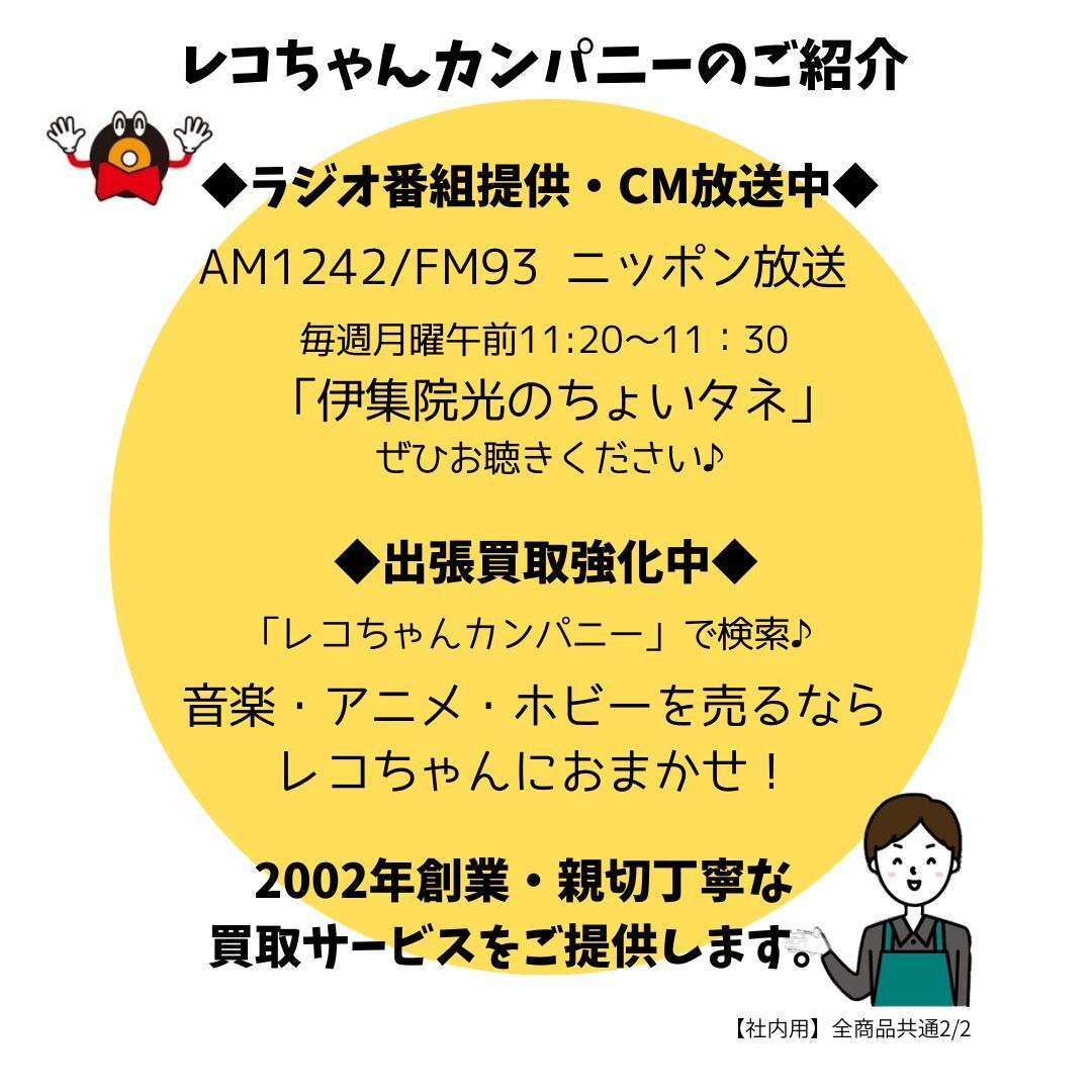 | 商品の状態 「ディスクの状態」…おおむね良好です。 「ケース・ジャケットの状態」…擦れ、日焼け、わずかな汚れが見られます。 「その他の付属品」…ブックレットにヨレ、擦れがあります。 記載のない付属品はありません。 *特に記載がない場合でも、通常の使用、再生には支障の無い程度のキズ、汚れがある場合がございます。 *画像に写りきらないキズ、汚れがある場合がございます。 *「処分品」「ジャンク品」として出品している商品は、再生不良を含め、一切のクレーム、返品、返金はお受けできません。ご了承の上入札、購入してください* | |