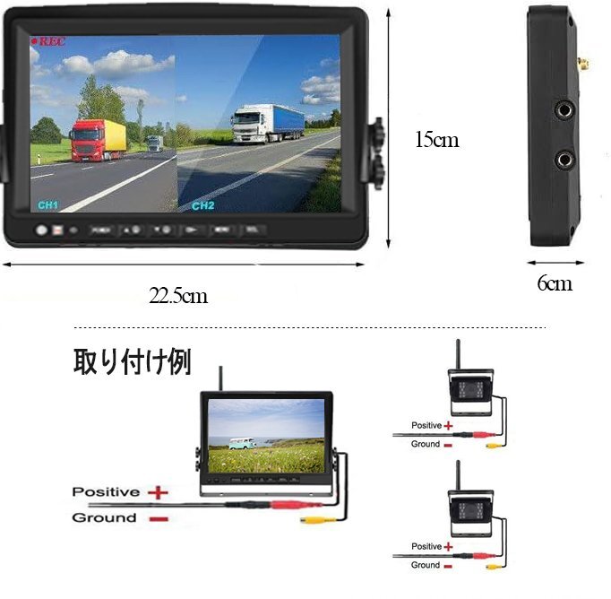 ドライブレコーダー ワイヤレス2画面 同時表示 無線 9インチモニター LED バックカメラ 2台 付き セット 録画 12V 24V リモコン付き