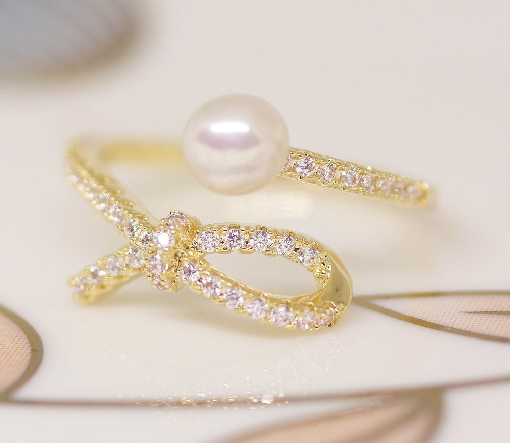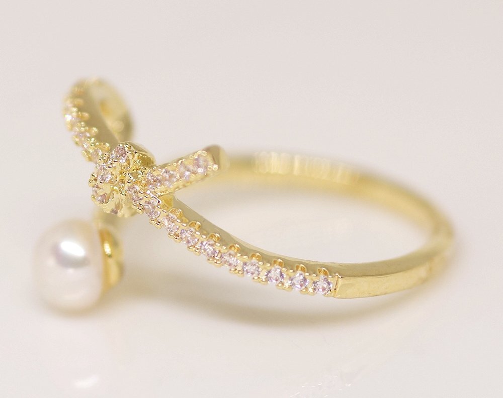 18K RGP ゴールド ダイヤ CZ リボン パール リング gu1507e