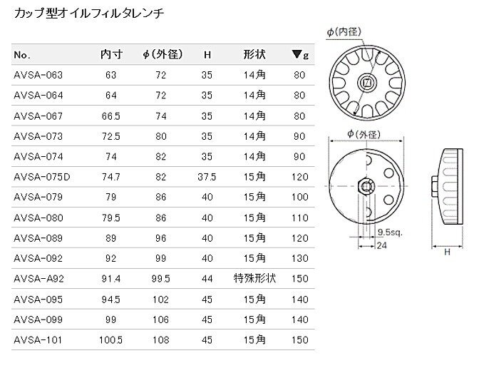 AVSA-074 カップ型オイルフィルターレンチ 差込角3/8"(9.5mm)sq |