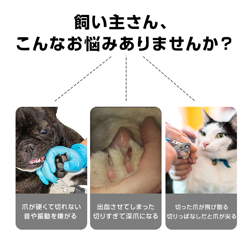 | 爪切りが苦手なペットにも安心して使える、電動爪切りです。回転して爪を少しずつ削るから、深爪や出血を防ぎ爪ケアにもオススメ!ダイヤモンド砥石製でスムーズかつ安全に削れる。低振動低騒音設計でペットが怖がりにくい。爪の硬さに合わせて回転速度を調節。軽量で持ちやすく、初心者でも操作が簡単。ヘッドは水洗いで清潔に、長期間使える。切りくずが飛び散らず掃除がしやすい。USB充電式でコードレス、どこでも使用可能。商品名:ペット用 電動爪切り,対応ペット:猫、小型犬、中型犬、大型犬、小動物(チンチラ、ウサギ、鳥)など,寸法:底部直径約3.5cm*高さ約14.0cm,重量:約104g,充電時間:約1.5時間,使用時間:最大8時間(爪の硬さや電池の消耗によって変動します),内容物:本体*1、USB充電ケーブル*1、ガードカバー*1、キャップ*1、研磨ヘッド*1,※本体は非防水です。5V1A充電アダプタは別売です。※製品改良のため、仕様や外観が予告なく変更される場合がございます。※生産ロットやモニター発色の具合により、商品画像と実物で寸法/形状/色味等が多少異なる場合がございます。※本商品の使用時に生じた事故や損害について、弊社は一切の責任を負いかねます。 |