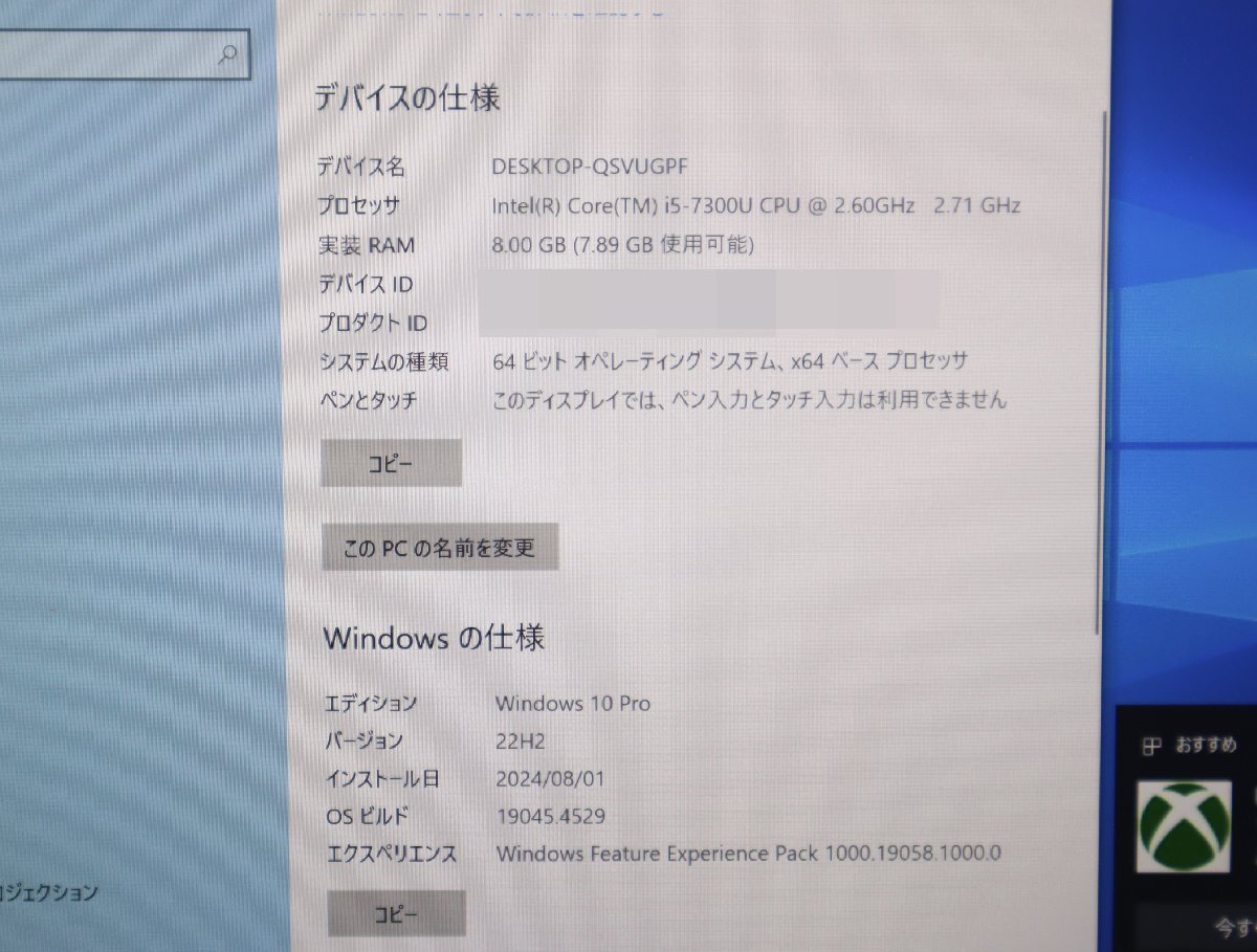 ■カテゴリー別のリンクはこちら■ →測定器・アマチュア無線 →工具・農業機械 →カメラ・映像機器 →オーディオ・楽器 →スポーツ・レジャー・自動車関連 →PC・周辺機器・ゲーム →ミシン・店舗用品・その他 ■商品説明■ サイズ:約 28× 20.5× 3.5cm Windows10 Pro 初期化済み CPU:Core i5-7300U 2.60GHz 2.71GHz メモリ:8.0GB SSD:256GB 当方でテスト用のアダプターを使用し、 できる限りのテストをしたところ 電源が入ることを確認しました。 本商品に対して専門ではないために 細部に渡る細かなチェックはできておりません。 また、中古品としてご理解いただき、 ジャンク品としてノークレーム・ノーリターンでお願い致します。 ■外観■ 状態については写真判断の程よろしくお願いいたします。 中古品ですのでキズ、汚れ、擦り傷などが有ります。 付属品に関しては、写真の物が全てです。 アダプターは付属しません。 *********************************** 台車やパレットを撮影用に使用している場合、付属しません。 バッテリー等の消耗品が付属する場合 どの程度消耗しているか不明ですので、保証は致しかねます。 ************************************* ノークレーム・ノーリターンでお願いいたします。 | ||||