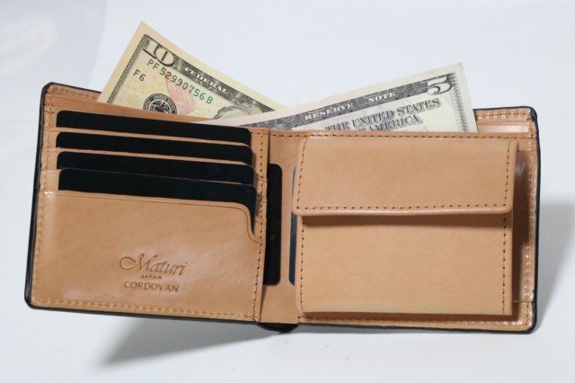 | コードバンにバッファローレザーを組み合わせた二つ折財布。 外側は『革の宝石』と呼ばれるコードバン(馬尻革)を贅沢に使い、内側はバッファローレザー(水牛の革)を使うことにより、シワ・型崩れがしにくく、コードバンとバッファローレザーの独特の肌触りと艶が最大限まで発揮されて作られています。 シンプルなデザインに仕上げ、コードバンの高級感と自然な風合いのバッファローレザーで幅広い年齢層の方に人気です。 長年の愛用で、他にはない味のある逸品に仕上がります。 素材に拘り抜いた財布。 是非その手でお確かめ頂きたい。 【コードバン】希少性から皮の宝石と呼ばれている。柔軟で強靭で艶があるのが特徴。 【バッファローレザー】ソフトで柔らかく、表面に独特のシボがあるのが特徴。 ■定価:29,800円 ■カラー:外側/ブラック、内側/キャメル ■サイズ:(約)縦11cm×横9.5cm、マチ2cm ※実寸計量につき誤差はあらかじめご了承ください ■素材:外側/馬革(コードバン)、内側/バッファローレザー(水牛革) ■仕様:札入れ×2、小銭入れ×1、カード入れ×4、ポケット×2 | |