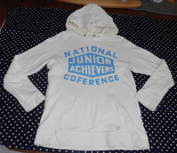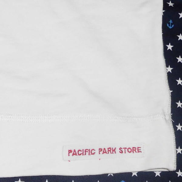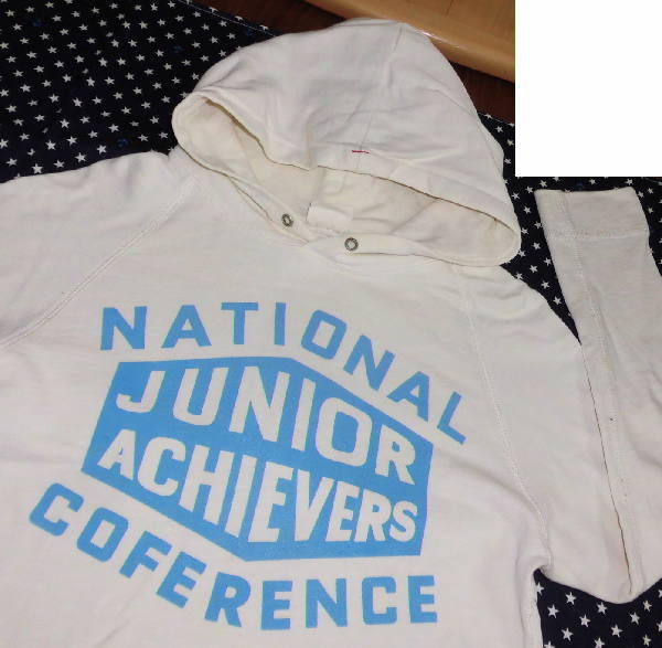 | よく着用しましたので、使用感があります。 フードのふちに黄ばみ、ポケットに薄いシミ、左袖にシミ1つ、 右袖口にシミ、両わきフチに少し毛玉があります。 お安くどうぞ! ☆ サイズはFREE ☆ クリーム色の入った白系 ☆ 実寸は、身丈59センチ、脇下の幅46センチ、裾幅47センチ、長袖 ☆ 綿100%、薄手 ☆ 前身頃にプリント入り ☆ カンガルーポケット1つあり パシフィックパークストア | ||