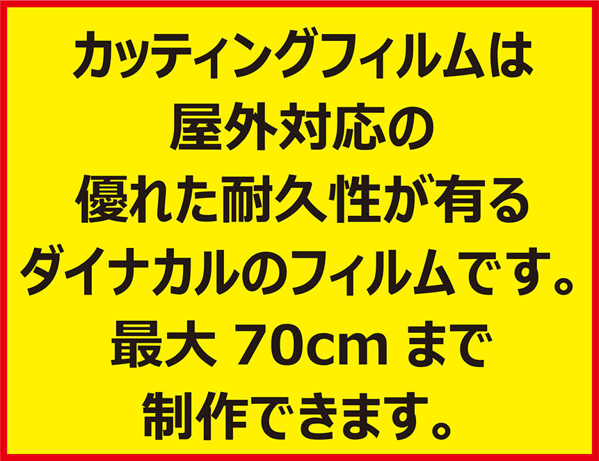 屋外対応優れた耐久性が有るダイナカルのフィルムです。 高い耐候性と安定した品質で、街の看板などさまざまなところで 幅広く活用されているフィルムです。 転写シートを貼った状態で発送しますので 直ぐに貼り付けできます。 カッティングステッカーを貼る場所は、油分、ホコリなど 綺麗に拭き取り、テープなどがしっかり付かない場所には 貼り付け出来ません。 |