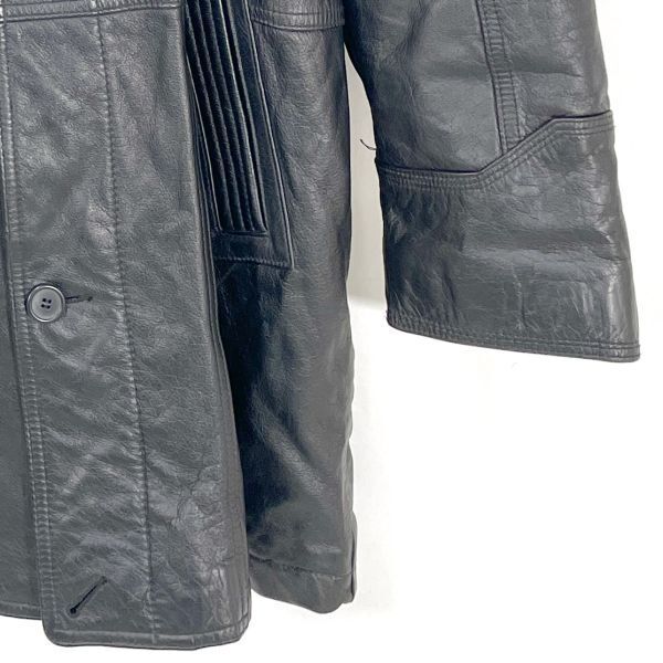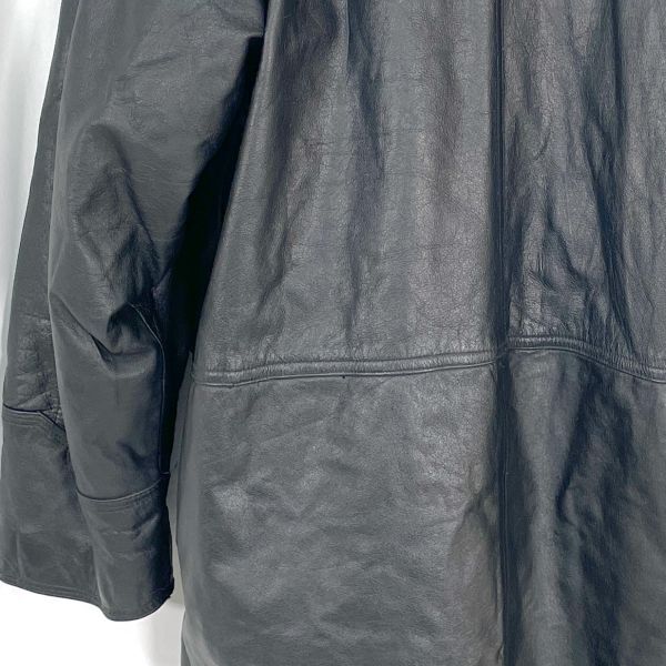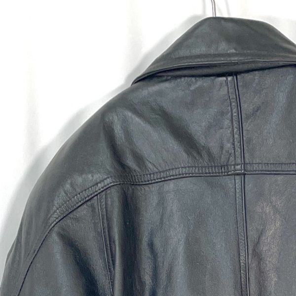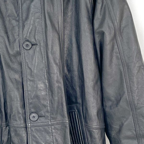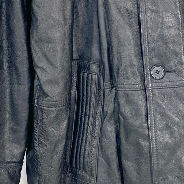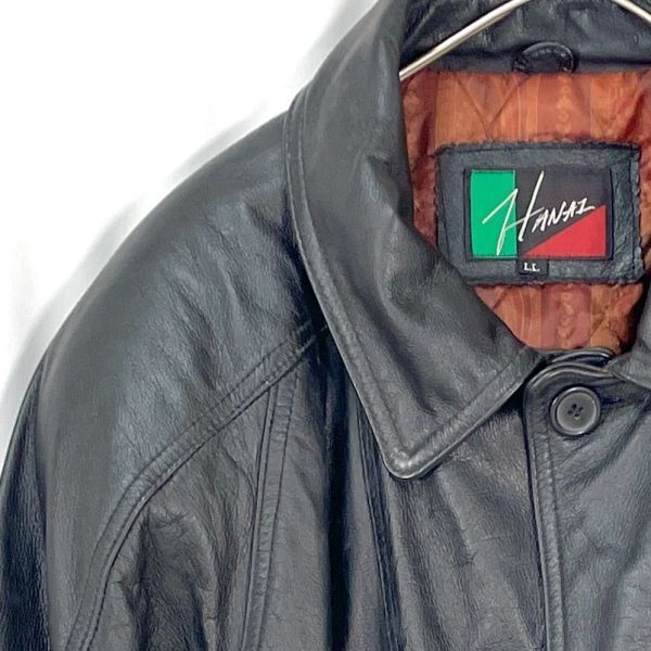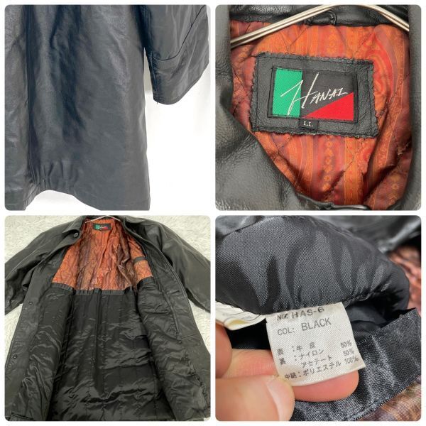 HANAIのレザージャケットコートです。 上質な本革を使用し、しなやかで深みのあるブラックレザーが魅力。 裏地はキルティング仕様になっており、保温性にも優れています。 フロントはボタン開閉タイプで、クラシックなデザインが特徴。 大人のスタイルにマッチする落ち着いた印象の一着です。 カラー:ブラック 素材:レザー(本革) / 裏地 ポリエステル サイズ:LL(平置き採寸) 肩幅 約53cm 身幅 約56cm 袖丈 約53.5cm 着丈 約94cm 裏地:キルティング仕様 クラシックで存在感のある本革コートです。 画像にあるものが全てです。 ★状態 特に目立つダメージ無く綺麗な状態です。