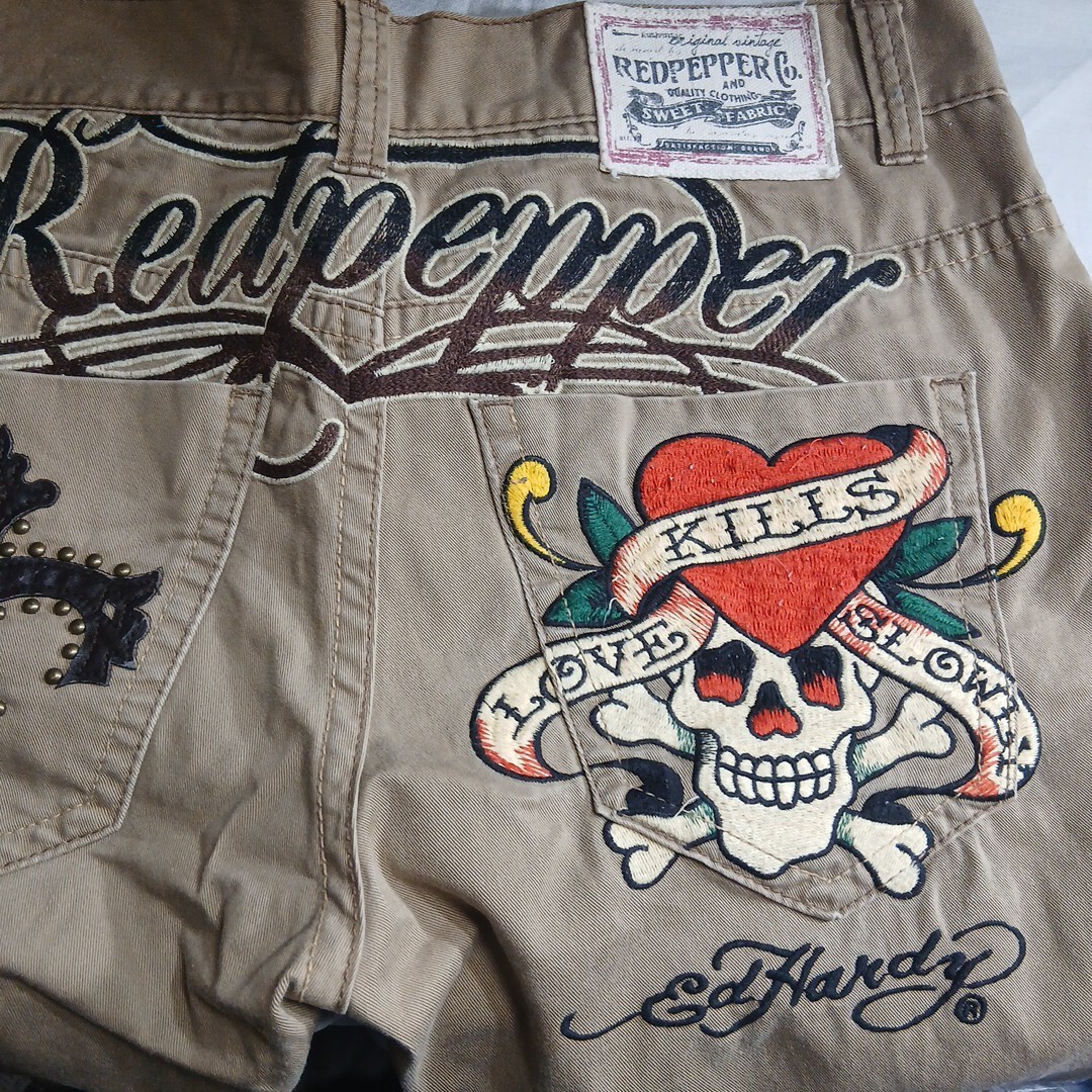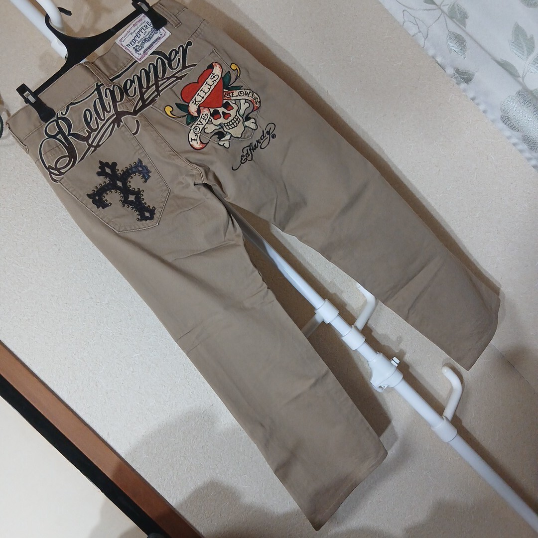 レッドペッパー×エド・ハーディー(レッドペッパージャパン)のジーンズです。サイズは32で、実寸でおおよそウエスト43センチ、股下71,5センチ、裾幅22センチです。素材は、綿100%です。色は、ベージュです。多少使用感などございますが特に目立つキズや汚れは無いと思います。