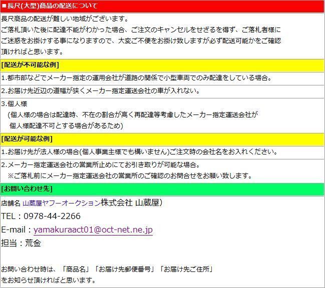 | 重量物や長尺商品につきましては、お届先の道路状況やメーカー提携運送会社の 配送車両の関係でご指定ご住所まで配達が出来ない場合がございます。 該当商品をご落札予定の場合は事前に配送が可能かのお問い合わせを頂ければと 思います。 |