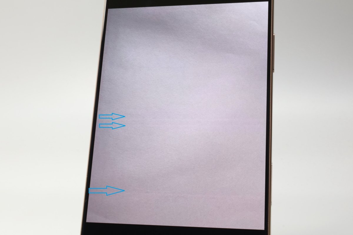 ・インカメラ撮影時、写真ともに横(青矢印)に光のラインが写り込みます(写真6 ※インカメラで撮影した写真を撮影してます)