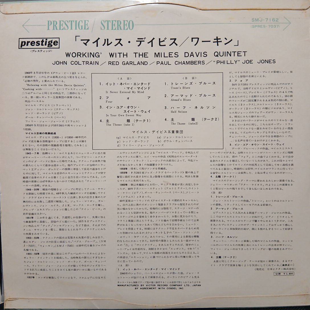 日本PRESTIGE (VICTOR)、LP。1964年。初期のペラジャケ。オリジナルに忠実なイエロー・ラベル、深溝(Deep Groove)ありの大迫力サウンド。マラソン・セッションの名盤。"Four"が収録されているのが本作。ジャケ、盤ともに年代の割りには状態いい方ですよ。オリジナル盤に近いプレスを探している人はぜひ。
