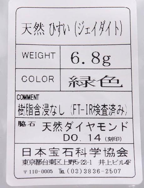 | マテリアル | 天然翡翠(カラット刻印なし)、天然ダイア計0.14カラット(カラット刻印あり)、プラチナ900製 |