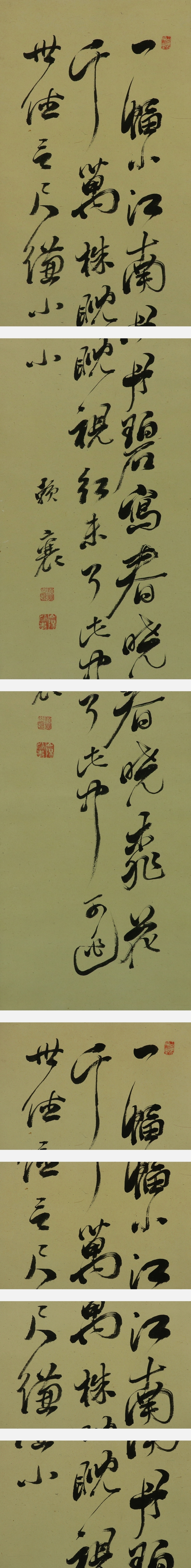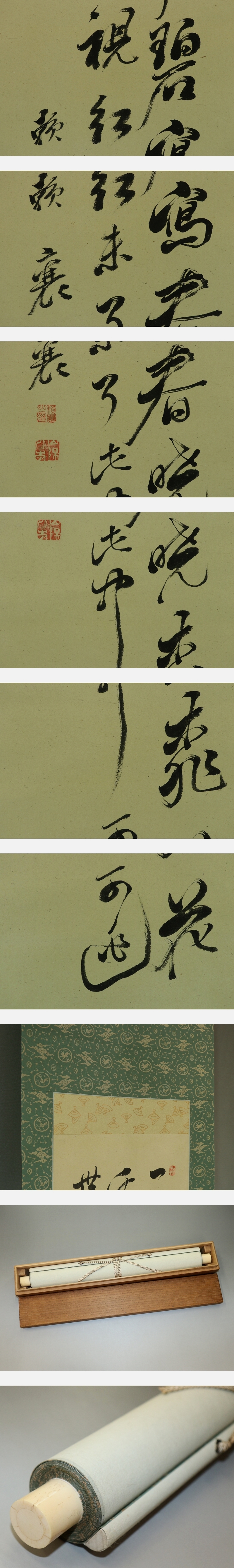 頼山陽 らい-さんよう (1781-1832) 江戸後期の儒者・勤王家。大坂生。広島藩儒頼春水の長男。 名は襄、字は子成、通称を久太郎、別号に三十六峰外史。 初め叔父頼杏坪について広島で学び、さらに江戸で尾藤二洲・服部栗斎に師事する。 のち京都に出て私塾を開き、書斎山紫水明処を営む。 門弟教育の傍ら日本各地を歴遊、篠崎小竹・梁川星巌・大塩平八郎・浦上春琴ら多くの文人墨客と交わった。 天保3年(1832)歿、53才。 本紙は、軽い皺、虫食い痕があります。 表装は、軽い汚れ、軽い皺、軸先にヒビがあります。 【サイズ】 作品 横約31.5cm×縦約135cm 表装 横約44cm×縦約219cm |