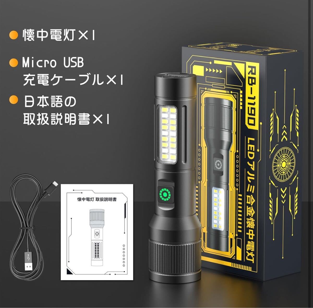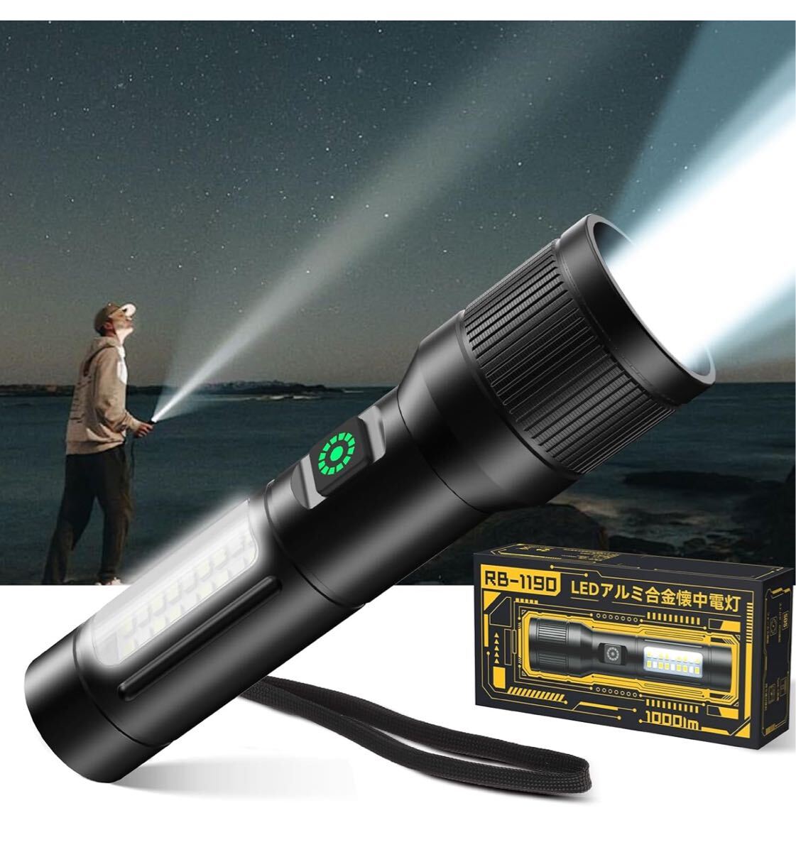 【高強度LED照明で&作業用COBライト&6つの多機能点灯モード】この懐中電灯は,高輝度の LEDを搭載し、最大1000ルーメンの明るさを実現、最大照射距離は500メートルに達します、投射された光束の明るさは完全に同じタイプの懐中電灯を超えて、緊急時にはCOB赤灯の点滅でSOS信号として使用でき、安全性を向上させます。懐中電灯のヘッドを伸縮させることで焦点距離を調整し、遠距離スポットライトまたは広範囲の汎光灯を自由に選択することが可能です。| 出价者 | 信用 | 价格 | 时间 |