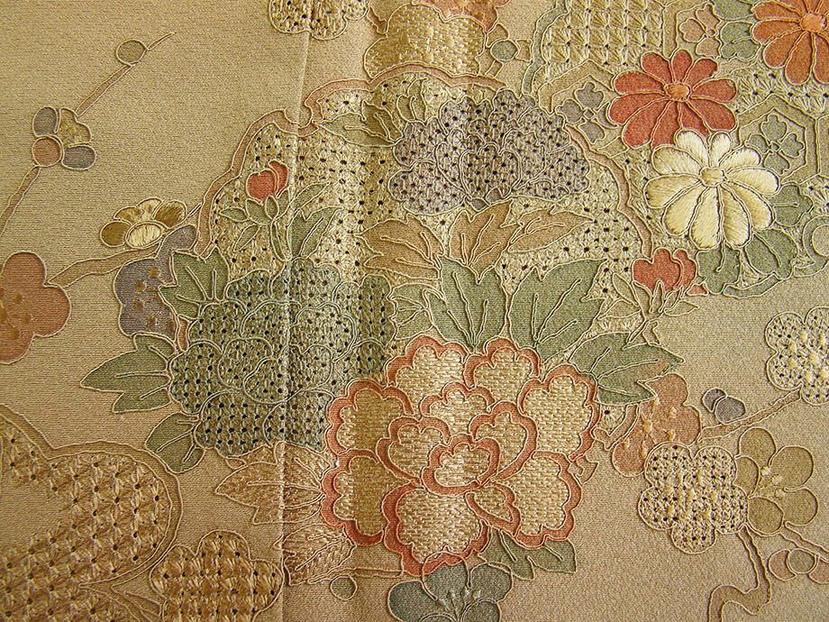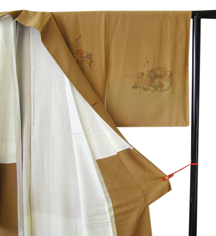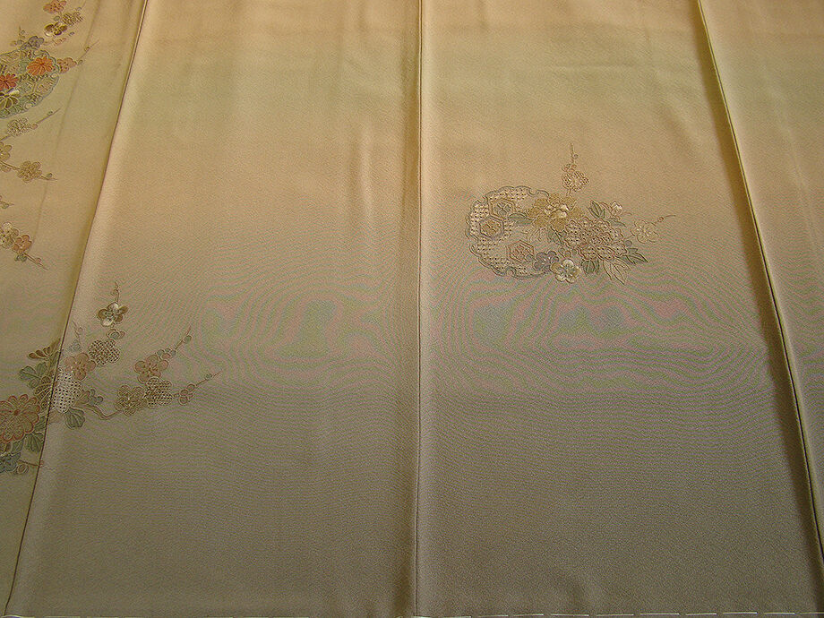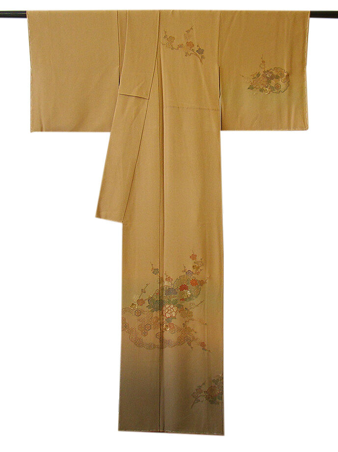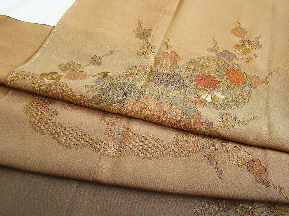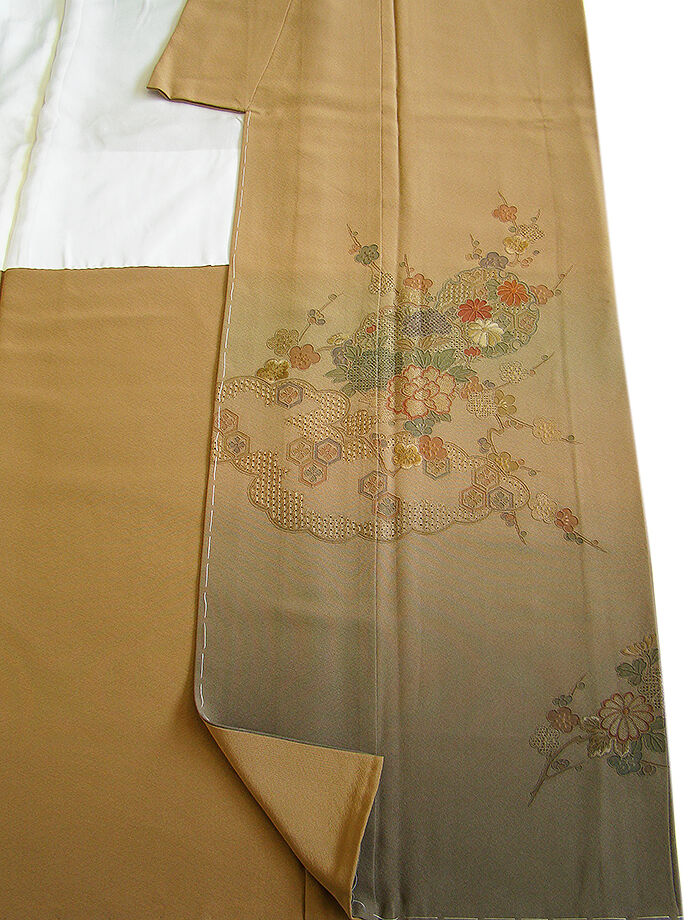 商品説明 | こちらのお品は「袷」でございますので、10月~5月にお召頂ければと思います。 大変にしなやかで滑らかな手触りの着心地良い重めの極上ちりめん地の生地、 渋い金茶色地に裾にかけて柳煤竹色ぼかし染に、精緻な手技を駆使した 極め細やかな花草、雪輪文、雲取り文等の総刺繍が丁寧に刺繍され、 重厚感のある匠の技の美しさをご堪能頂ける仕上がりとなっております。 お慶びのお席や今日を美しく愛でるかの様な装いを印象付ける 正統派のお着物として一枚は欲しい麗しいお着物です。 八掛は共布(正絹)、背に刺繍紋1ヶ、幅広い年代の方にお召頂けます。 |