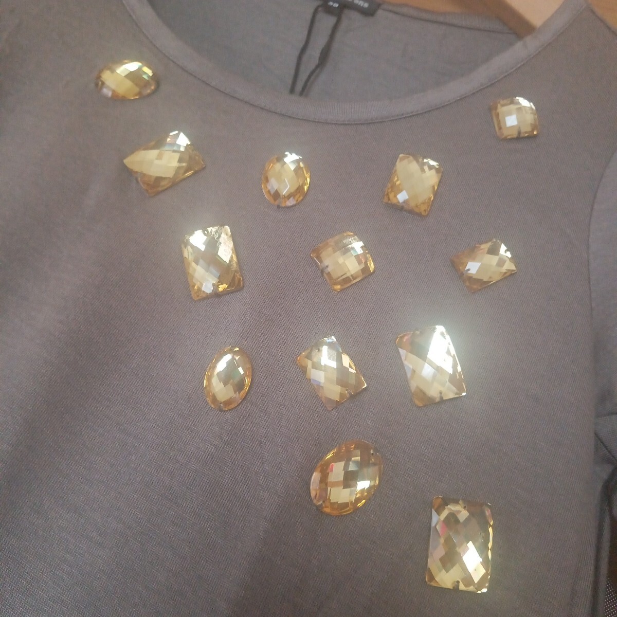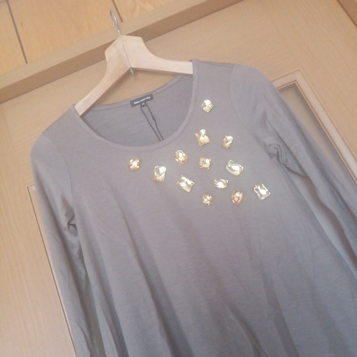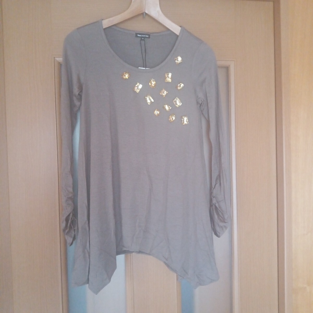 新品未使用タグ付き Deux mille ans ブラウン×イエロービジュー付き アシンメトリー 薄手 長袖カットソー M 收藏