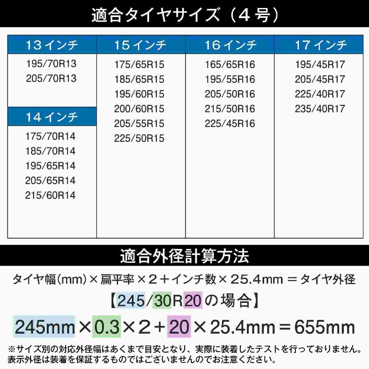 | 本商品の装着時の制限速度は40km/hです。40km/h以上の速度を出しますと脱落及び重大な事故の要因となりますので制限速度は厳守して下さい。 2輪駆動車の場合は通常駆動輪に装着してご使用下さい。ミニバンやワンボックス車は4輪に装着するとより安定性が増します。必ず装着タイヤに適合したサイズであることをご確認ください。 極端な偏平タイヤの場合、サイドウォールへのかかりが浅くなり脱落の危険性が増しますのでご注意ください。 耐久性は路面の状態や運転状況によって異なり、アスファルト及びコンクリート露出路面での装着走行は破損及び製品寿命を著しく低下させます。 本商品はあくまでも急な積雪時などの緊急用としてご使用ください。タイヤ形状や偏平率、空気圧等の条件によっては適合サイズであっても装着しにくい場合や車種によっては装着ができない場合がございますので予めご了承ください。 本商品に破れ等の破損が生じた場合は、速やかに使用を中止して下さい。 本商品は改良などの理由で仕様が予告なく変更になる場合があります。 本商品のご使用時に発生したいかなる事故、損傷等におきまして弊社は一切の責任を負いかねます。 |