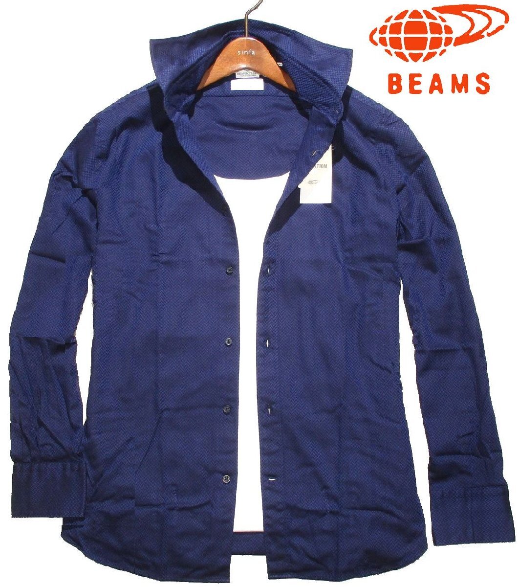 新品 秋物 M ▼ ビームス BEAMS HEART イタリア製生地 コットン100% カッタウェイ メンズ 長袖シャツ ヘリンボン 織り柄 紺 紫 ネイビー 收藏