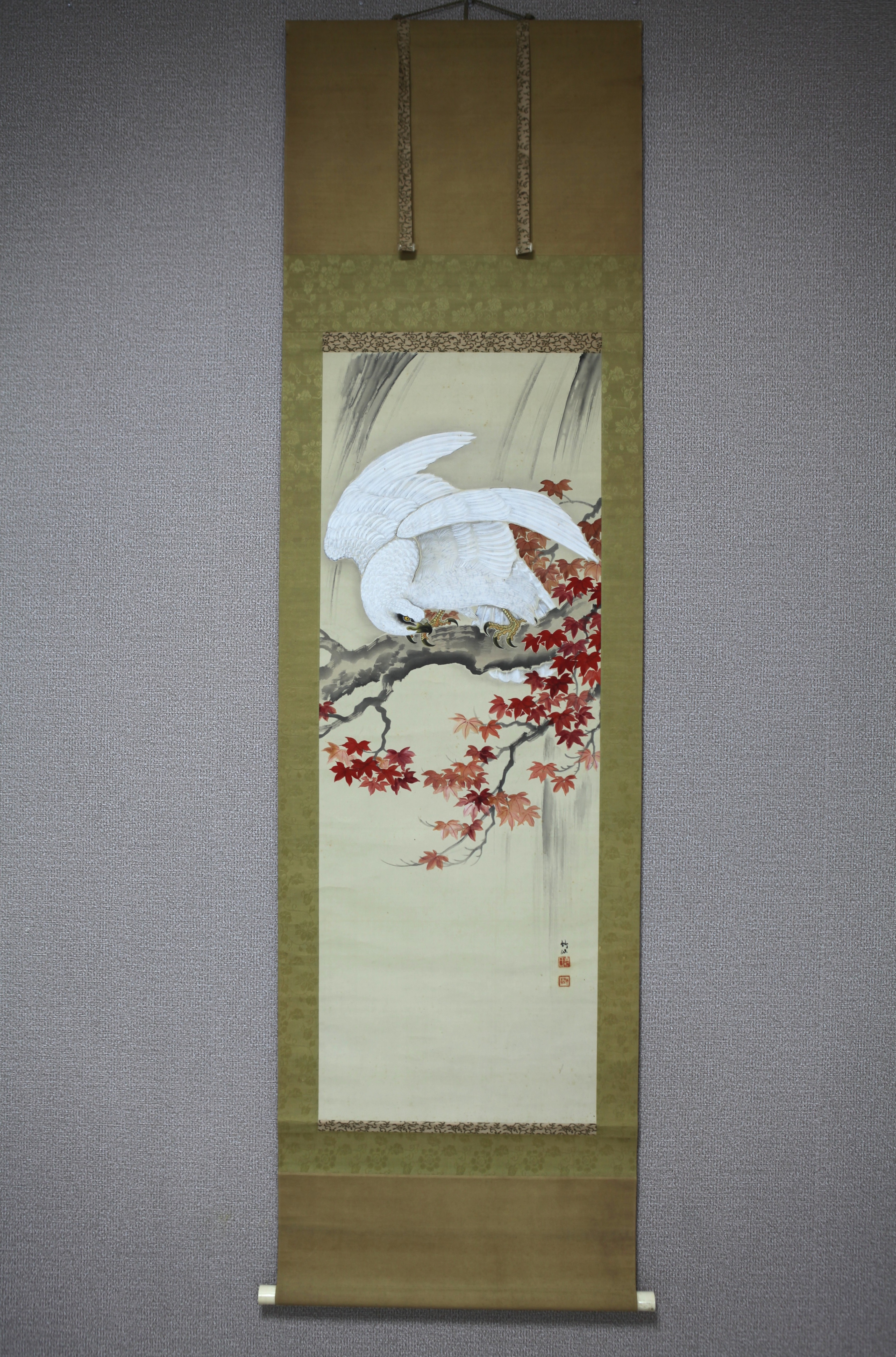 【真作】【風車】 青柳竹仙 「紅葉白鷹」◎肉筆絹本◎明治・大正期 日本画家 「帝国絵画番附」 「東京之部優秀画家」掲載 收藏