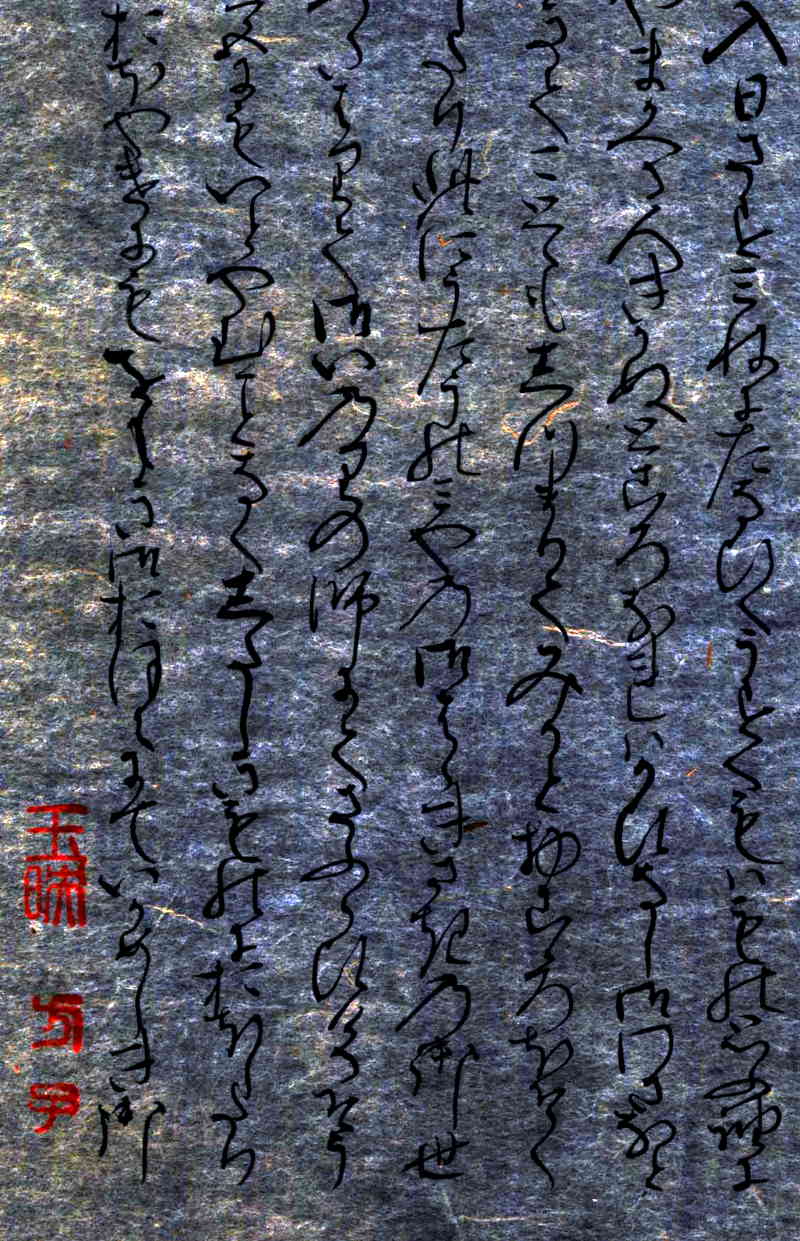 原文上部には「四望唯煙雲」《四望(しぼう)するも唯(ただ)煙雲(えんうん)のみ》という白楽天の漢詩の篆書印が押捺されている。漢詩の意味は、「あたりを眺めても靄(もや)と雲しか見えない」という意味。この漢詩は白楽天の「文集」の中の有名な一節です。紫式部が「薄雲」を書くに際し、「白楽天・漢詩集」の漢詩を熟読したうえで「源氏物語」の「薄雲の巻」を書いていることがわかります。この原詩の言葉の引用は、「薄雲の巻」に用いられていることで広く知られている。紫式部がこの原詩に親しんでいたことがわかる。