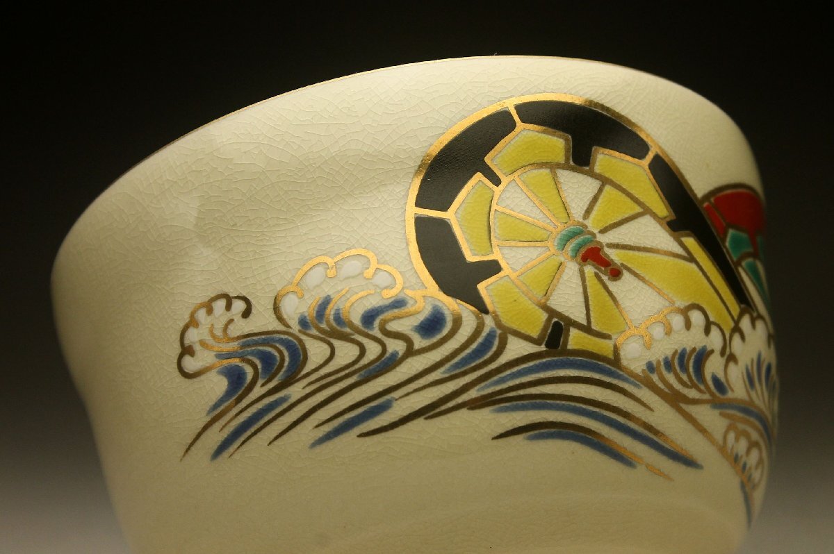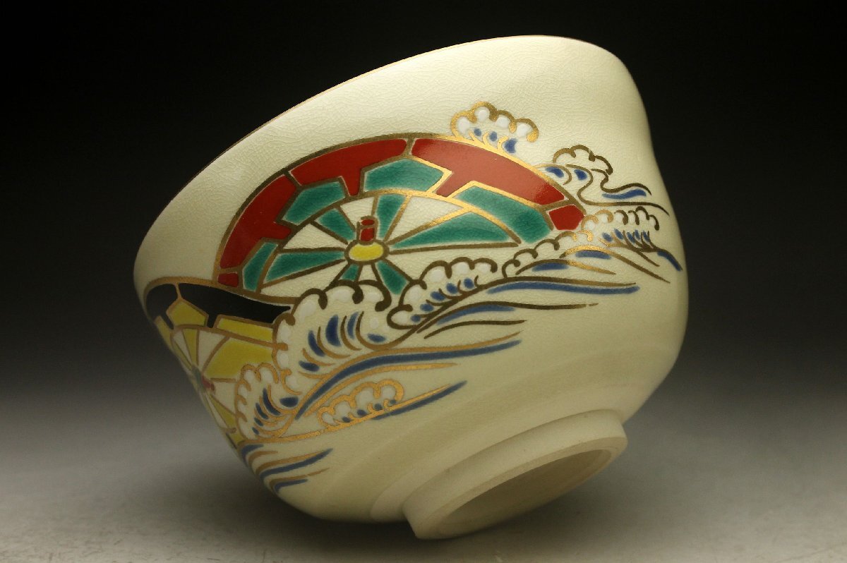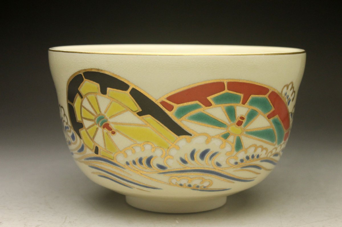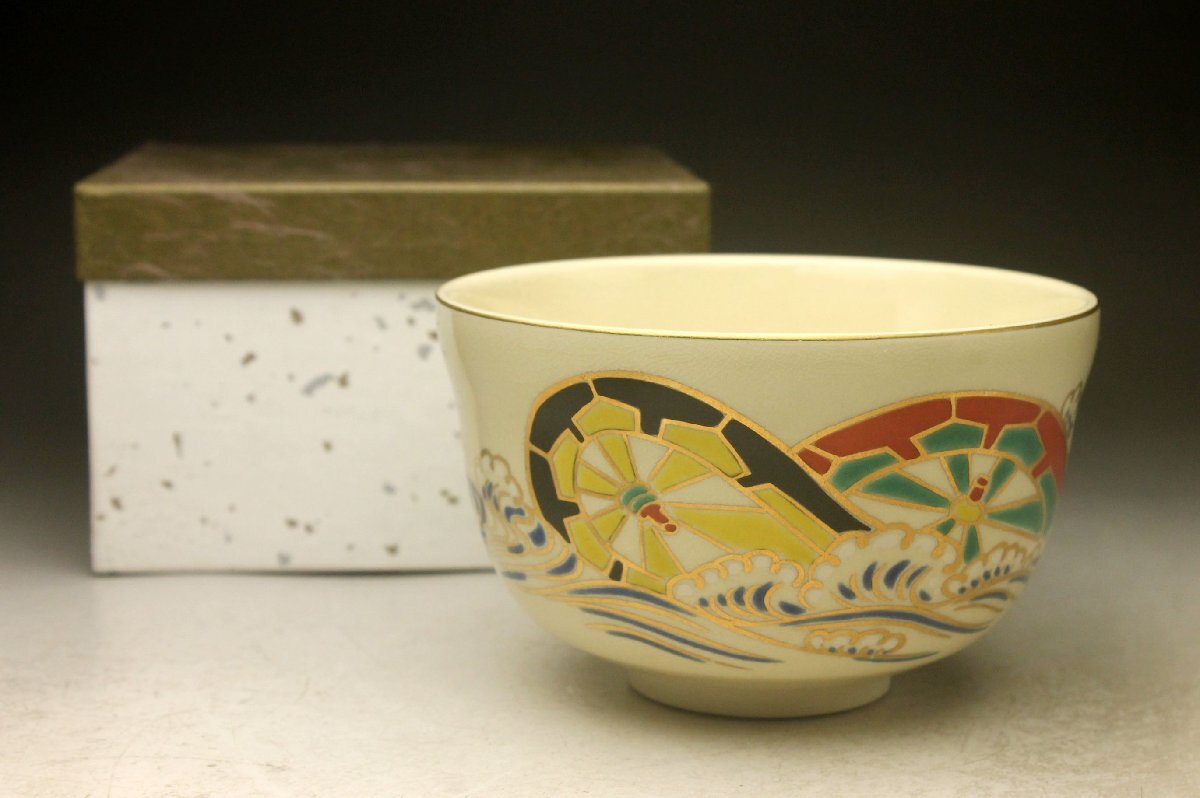 【余韻】 清水焼 宮地英香 色絵波輪文 茶碗★無傷美品 化粧箱<同梱可> 收藏