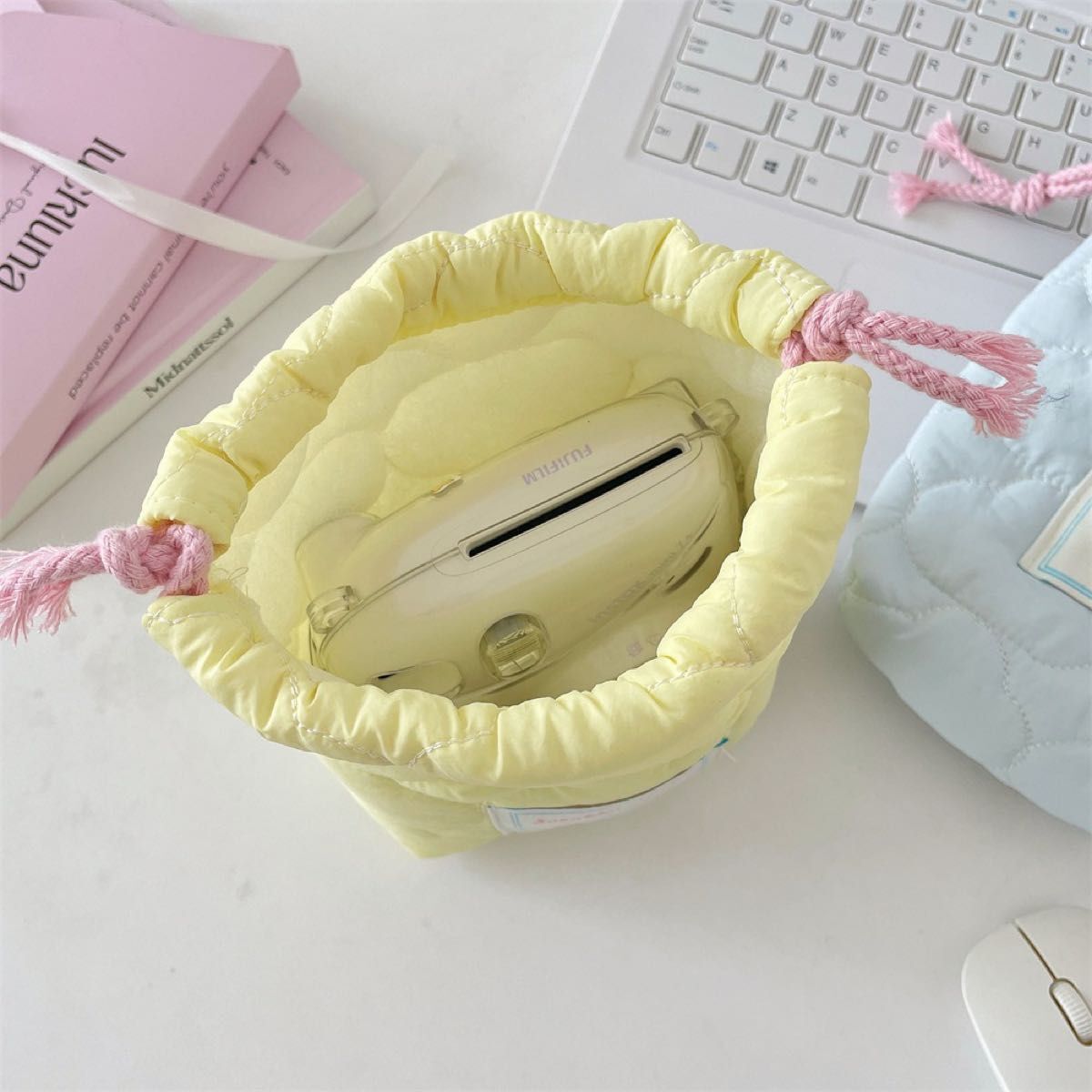 ☆送料無料☆カメラ 収納 カバー 巾着袋 ポーチ チェキ キルト加工 韓国 ハート 水色 チェック マカロンカラー 收藏