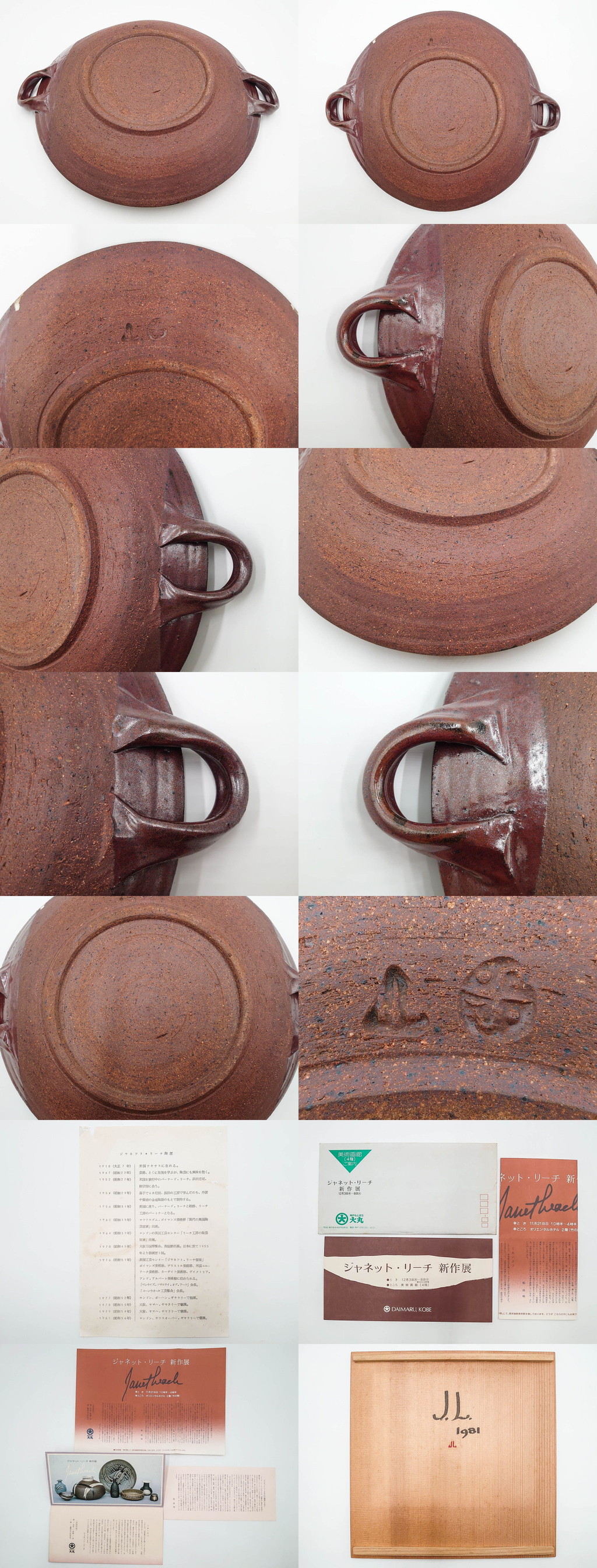 R-084379 1981年作 ジャネット・リーチ(Janet Leach) 取っ手付 赤地流釉 バーナード・リーチ夫人 約39cm 大皿(J・L,陶器,共箱付) 收藏