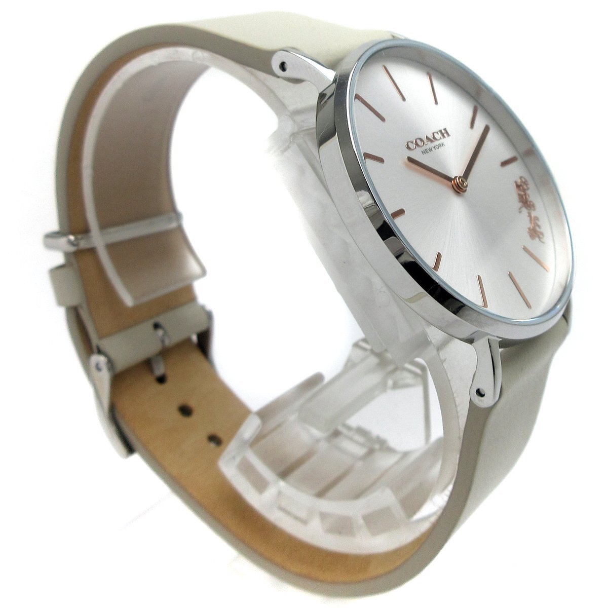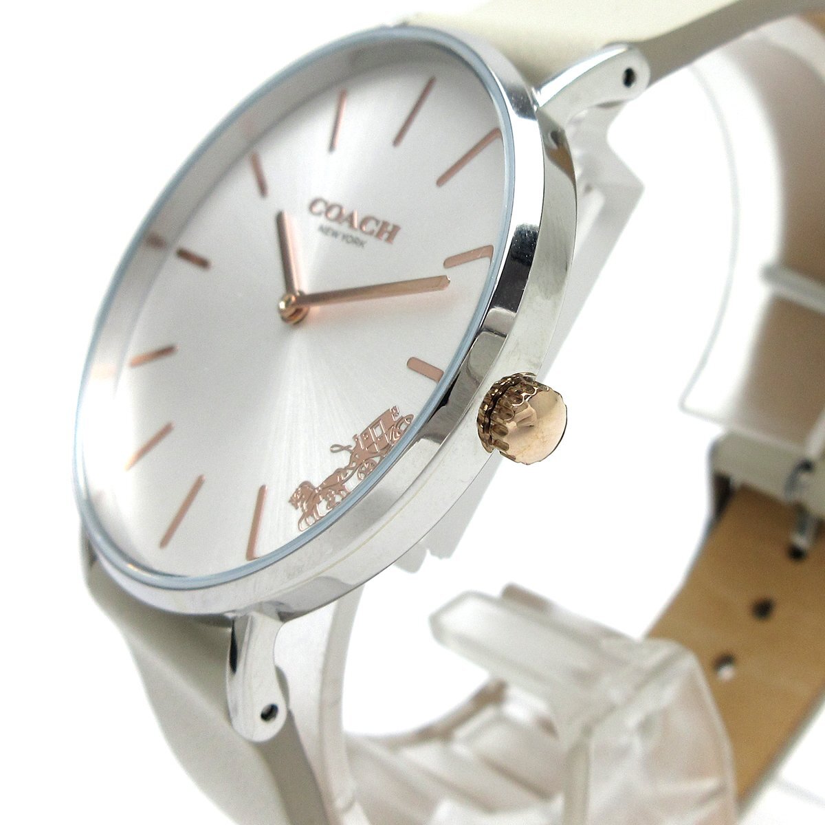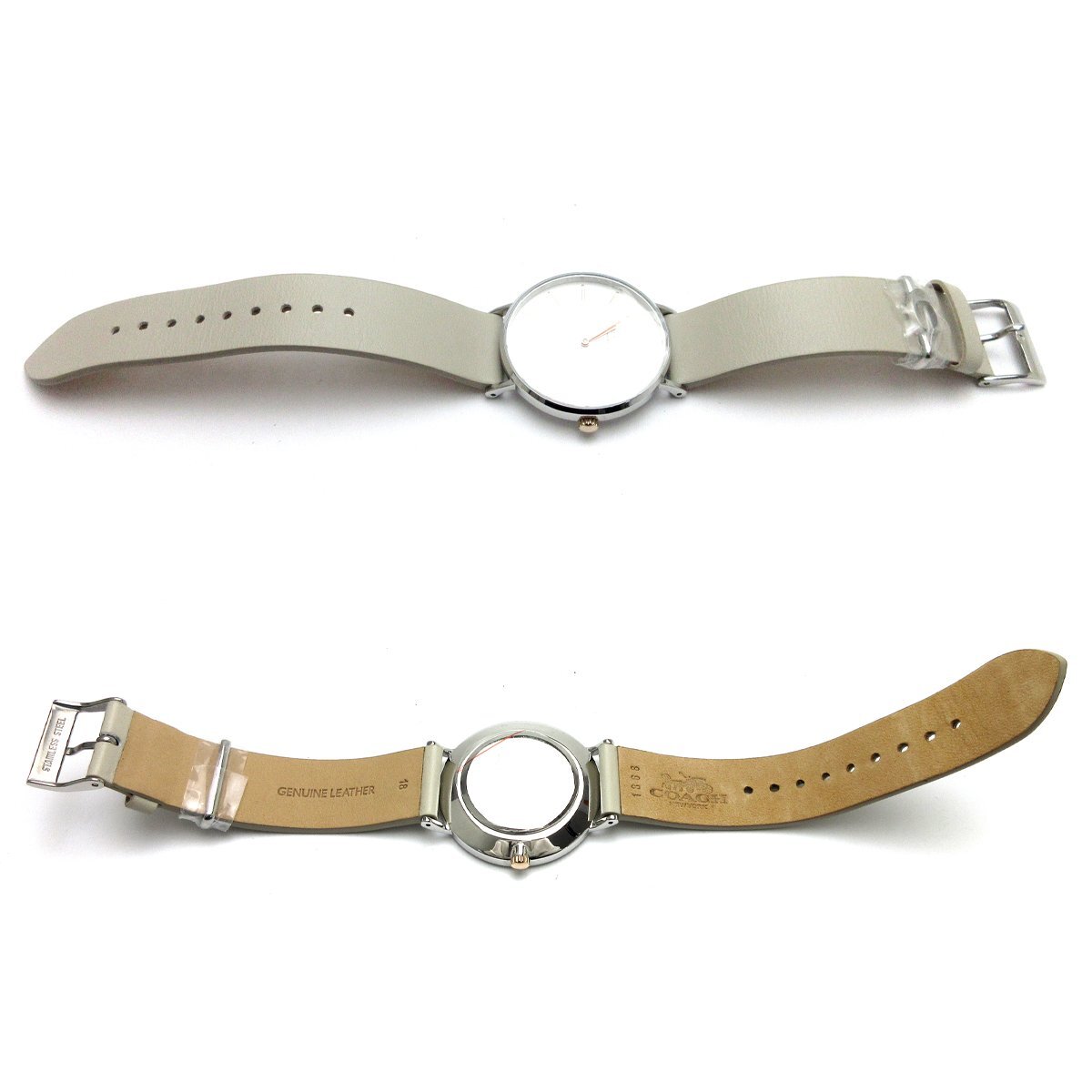 ■ニューヨーク・マンハッタンで創業、アメリカ合衆国のファッションブランド『コーチ(COACH)』。 ■シルバーケースにアイボリーのバンドを組み合わせた品のあるモデル。 ■インデックスとリューズは華やかなピンクゴールドカラー。 ■4時位置にはコーチのロゴがデザインされておりオシャレです。 ■日常使いから特別な場面まで幅広く使えるアイテム。 ◎日常生活防水。 ---【商品状態】--- ☆未使用 収納品。 ☆バンド、収納時のシワがあり、裏面に少し色ヤケ(ムラ)があります。 ※裏蓋に保護シールがついたままになりますのでお好みではがしてください。 ※商品画像はお客様のモニター環境によっては色調が異なって見える場合がございますのでご了承ください。 |