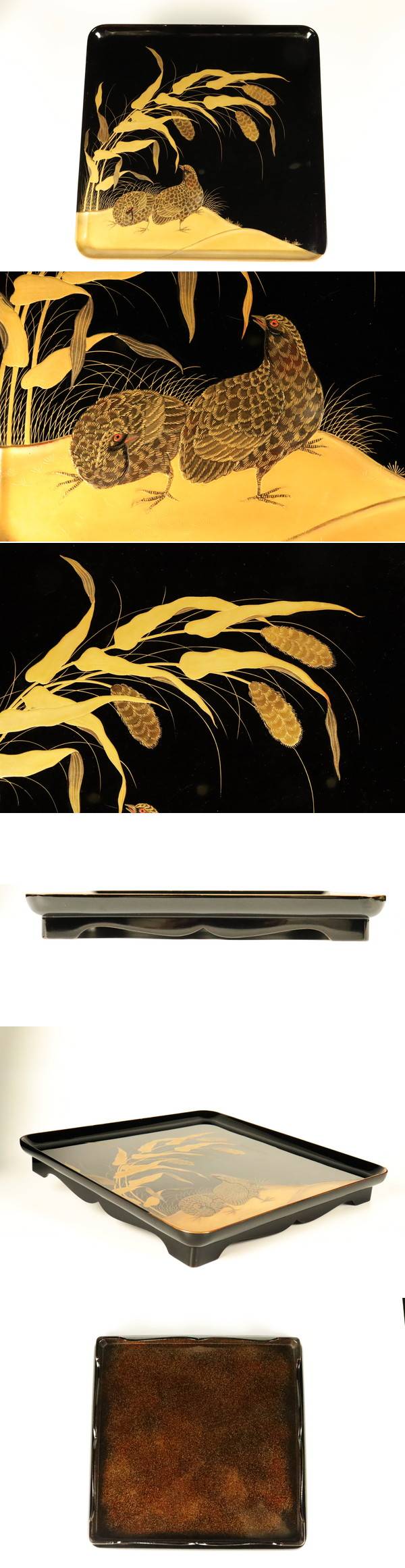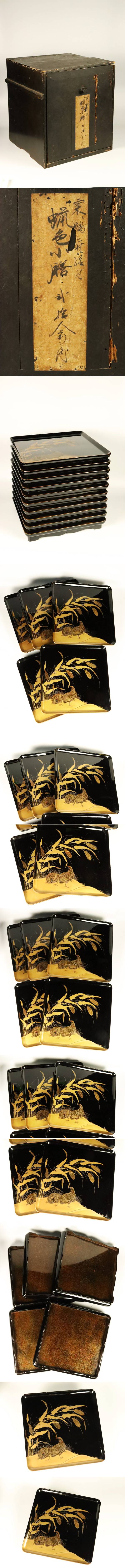 【ASAHI】時代木製漆器 金蒔絵 高蒔絵 黒塗四方吸物膳 足付 十客 木箱入り 茶懐石 状態抜群 旧家蔵出品[711132qt] 收藏