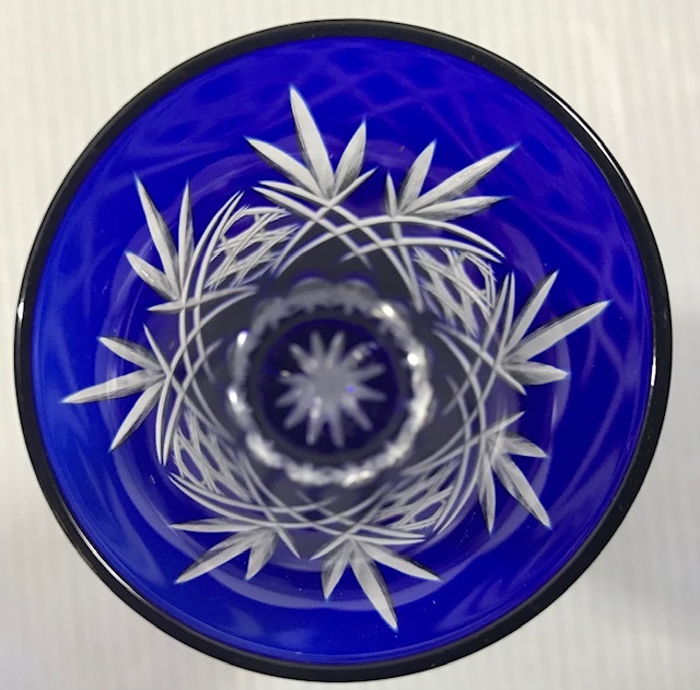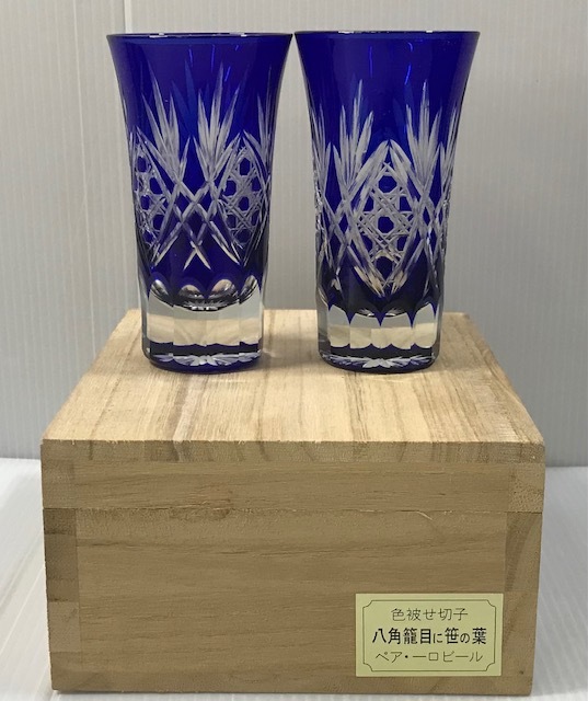 あ//つH5083. 【未使用・保管品】色被せ切子 八角籠目に笹の葉 ペア 一口ビールグラス 木箱入り 收藏