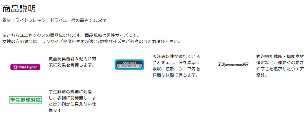 ミズノ [ローネック半袖アンダーシャツ] 12JAAP3014 ネイビー Lサイズ 收藏