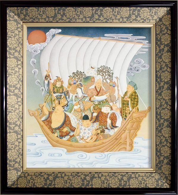 仏画 色紙額「七福神」複製画 紺色緞子 仏間 仏事の飾り 佛画 福徳の神々 大黒天 恵比寿 毘沙門天 弁財天 布袋 福禄寿 寿老人【84034】 收藏