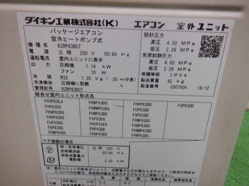 TKR7J-2/ダイキン/パッケージエアコン/内機FHP63G・2019年製/外機RZRP63BCT・2018年製/三相200V/天井吊型/2.5馬力 收藏
