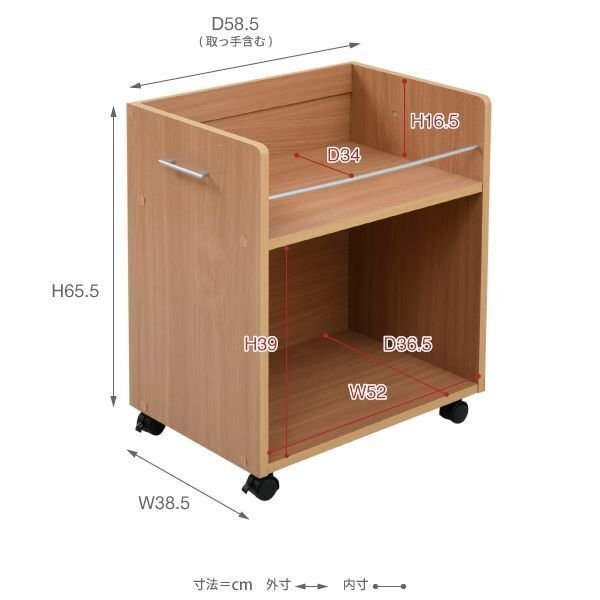 | 【カラー】 ダークブラウン、ナチュラル、ホワイト 【サイズ】 <外寸> 幅38.5×奥行58.5×高さ65.5cm/個 <内寸> オープン部:幅52×奥行36.5×高さ39cm 上部オープン部:幅52×奥行34×高さ16.5cm 【材質】 本体:プリント紙化粧合板 【耐荷重】 固定棚:(約)10kg以下 【生産国】 インドネシア 【梱包】 サイズ:64.5×45×20.5cm、重量:18.5kg 【その他】 ・キャスター4個(うちストッパー付き2個)/個 ・背面化粧有り 【組み立て品】 お客様による組み立てが必要です。 |