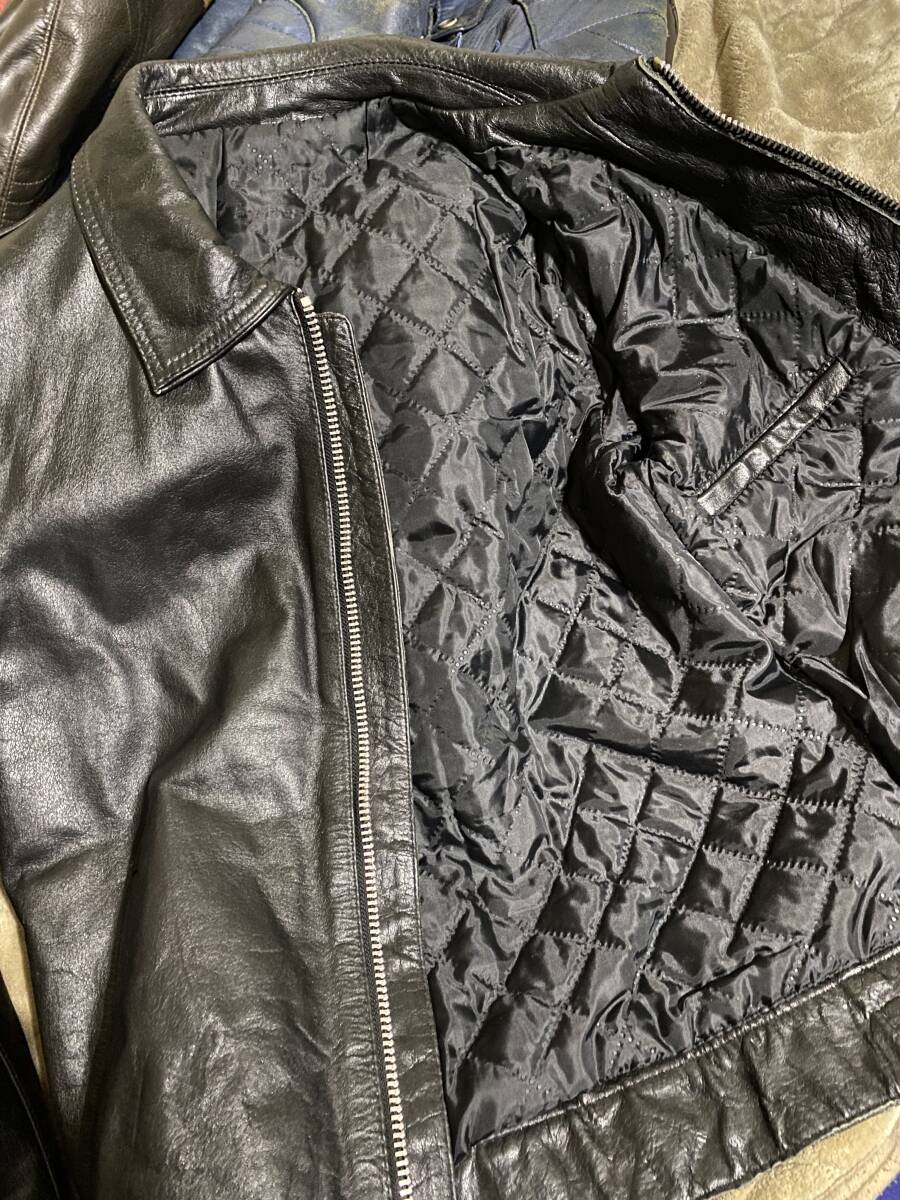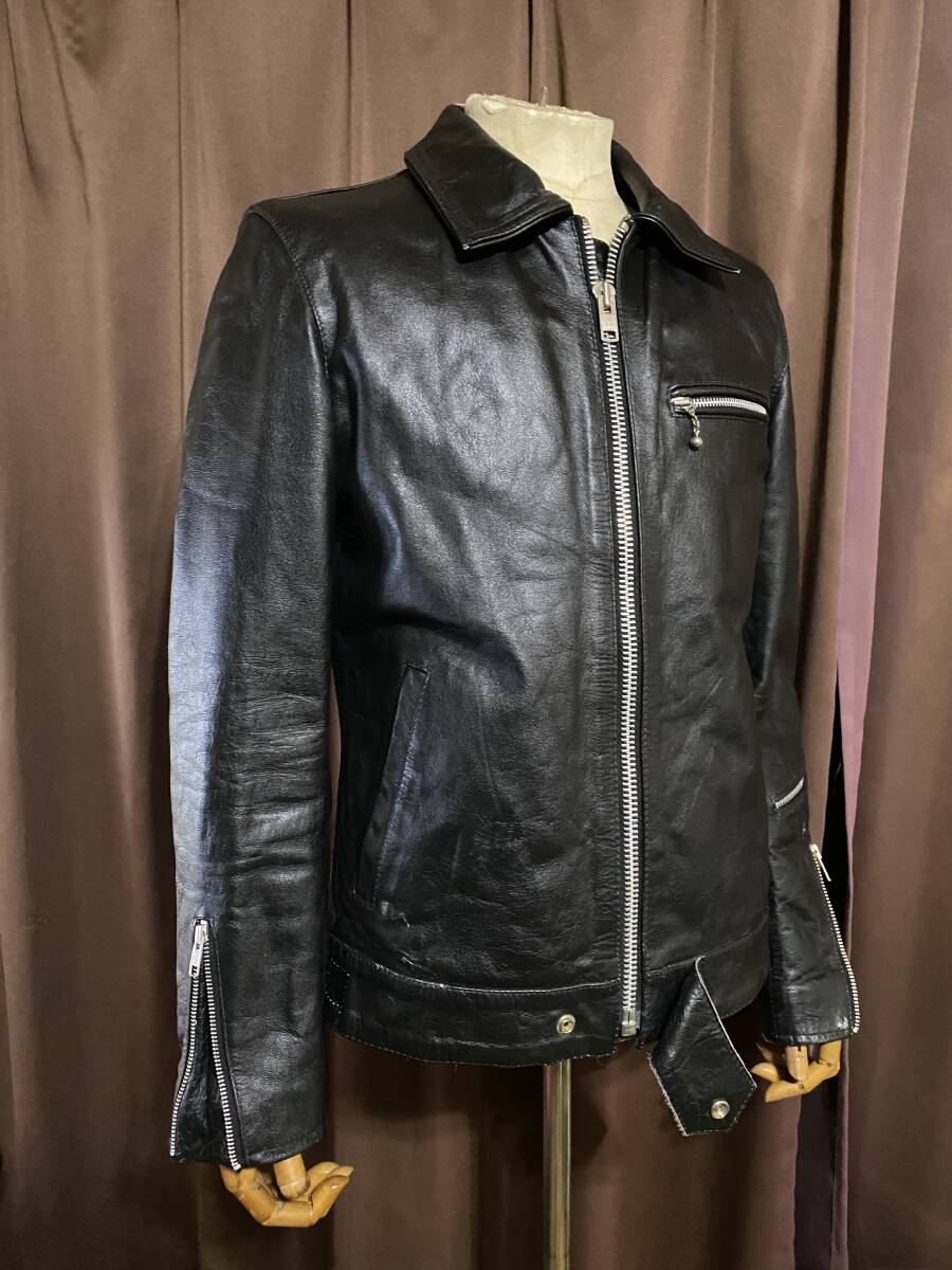だいぶ以前にロンドンで購入したライダースです。ドミネータータイプでシンプルなスタイルです。シドヴィシャスが着用していた物を思い出し購入しました。タイトな着用感が気に入って愛用しておりました。革は張りの強さとシボ感からバッファローだと思われます。記載サイズが無いのですが、実寸で肩幅44センチ、身幅50センチ、着丈63センチ、袖丈60センチとMサイズ位の着用感です。よく着用しておりましたので擦れなどございますが良い感じにエイジングが進んでいると思います。こちらはあくまで個人のコレクション出品になりますのであまり神経質な方や完全新品をお探しの方はトラブル回避の為ご入札お控えください。また入札をご検討頂ける方は必ず自己紹介欄をお読みになって気になる所などご質問ください。出来る限りお答えさせていただきます。ノークレームノーリターンで。他にも多数出品中ですので宜しければ覗いてみてください。