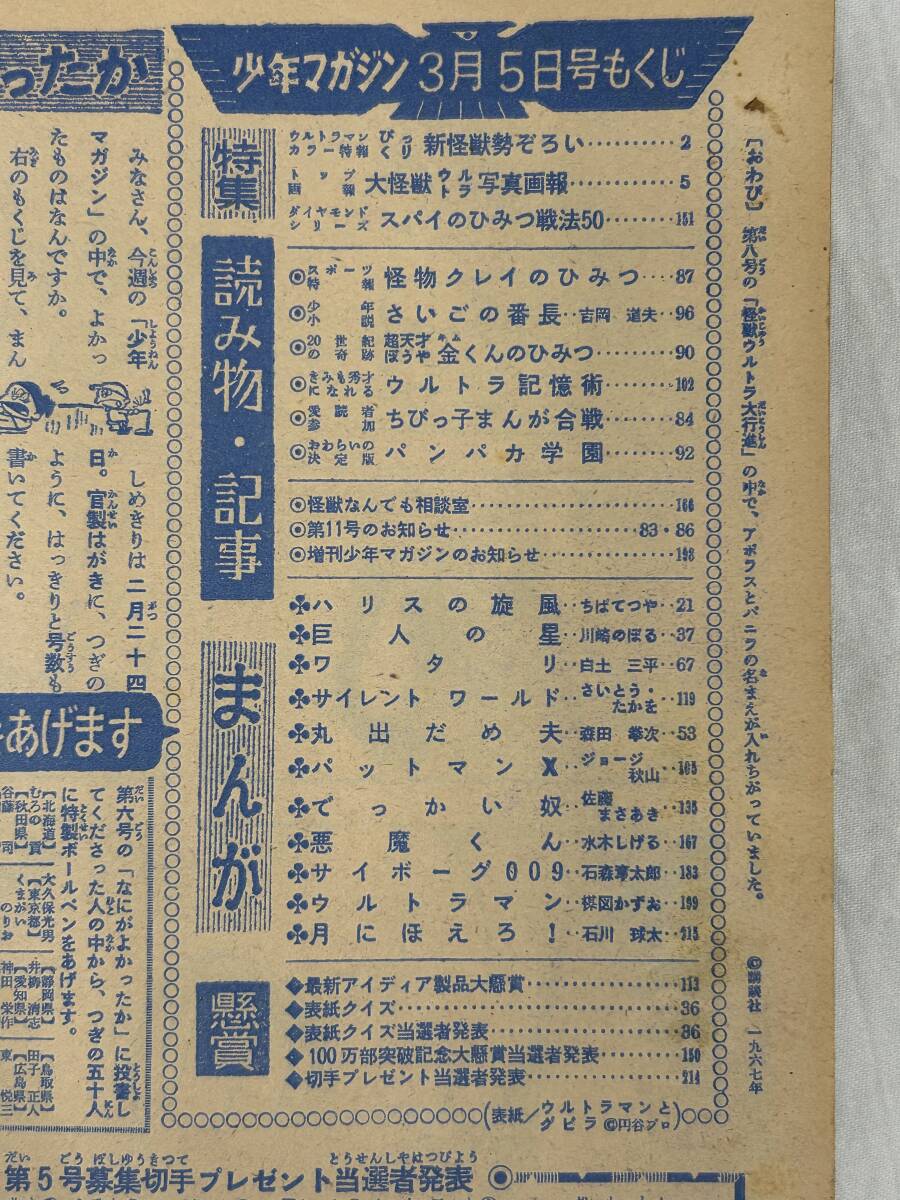 | 『週刊少年マガジン 1967年第10号』昭和42年3月5日発行/表紙:ウルトラマンvsグビラ/楳図かずお「ウルトラマン」/水木しげる「悪魔くん」等 | ||
