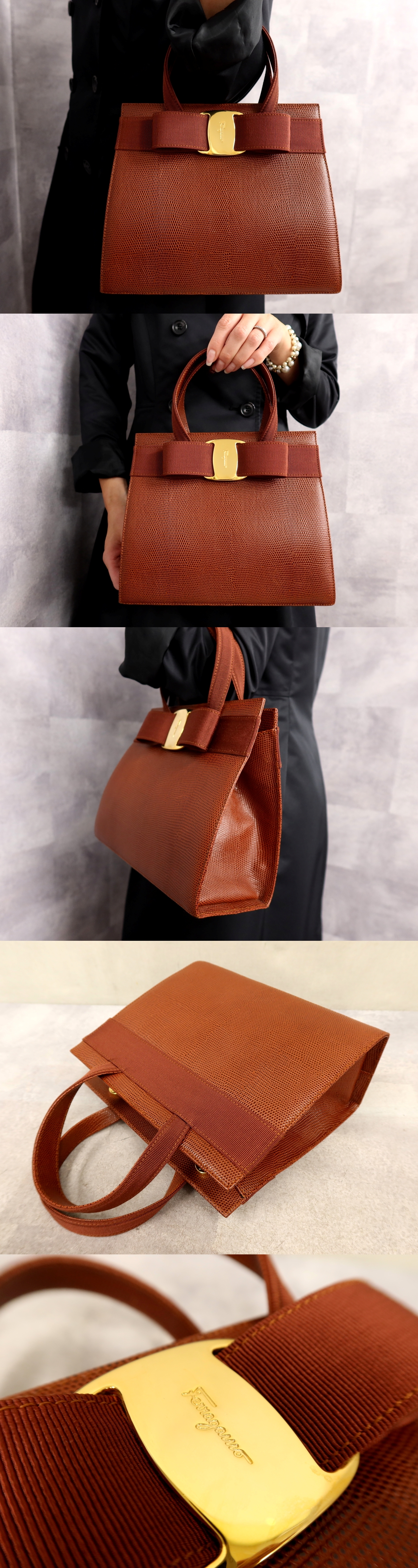 超美品●Salvatore Ferragamo フェラガモ●ヴァラリボン●リザード 型押し レザー 本革●ハンド バッグ●ブラウン●ゴールド金具●Js62086 收藏