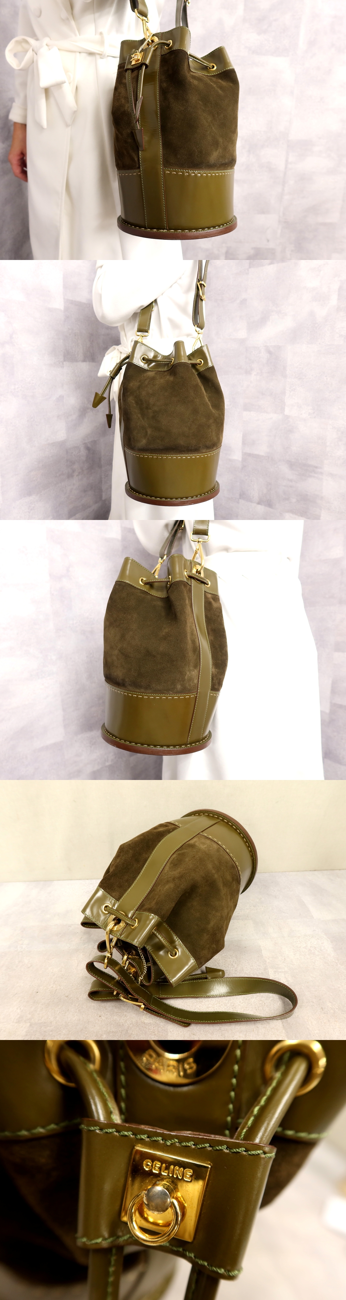 ●超美品●セリーヌ●ガンチーニ●スエード エナメル パテント レザー 本革●巾着 ショルダー バッグ●ブラウン カーキ●G金具●Js62404 收藏
