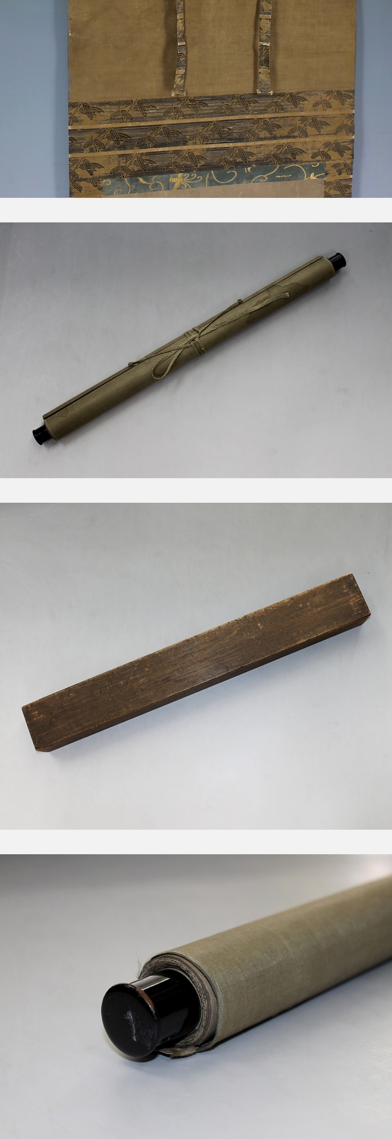 狩野興以 かのう こうい (不詳~1636) 江戸前期の画家。下野生。名は定信、字は中里。通称は弥兵衛、弥左衛門、興意等。 狩野光信の高弟として知られる。牧渓や雪舟を研究。紀州徳川家に仕え、 後に法橋に叙せられる。光信の弟の子(探幽、尚信、安信)を養育したと伝えられる。 本紙は、経年による折れ、皺、染み、汚れがあります。 表装は、染み、汚れ、折れ、皺、破れ、擦れがあります。 【サイズ】 作品 横約41cm×縦約47cm 表装 横約53cm×縦約133cm |