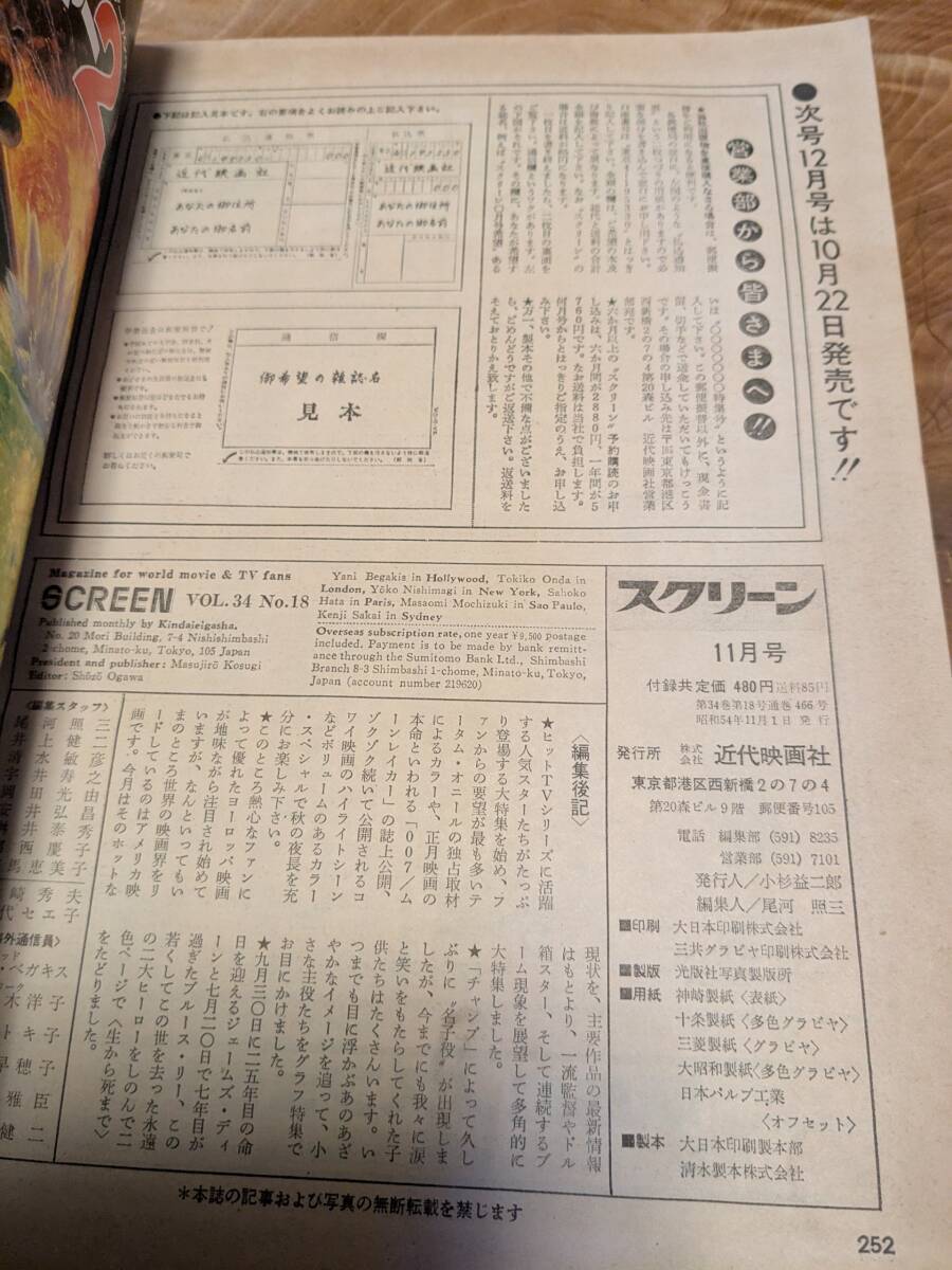 スクリーン 1979年11号【送料無料】付録なし 表紙リン・ホリージョンスン 大型口絵ウィリアム・カット 收藏