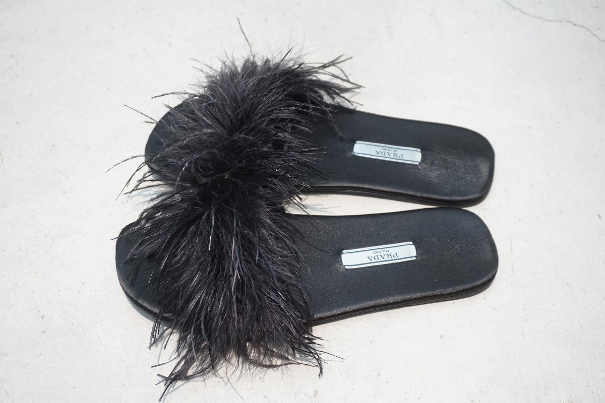 美品 正規 17SS PRADA プラダ FEATHER SANDAL フェザー ミュール サンダル スリッパ オーストリッチ ターキー ファー 36黒本物516O▲ 收藏